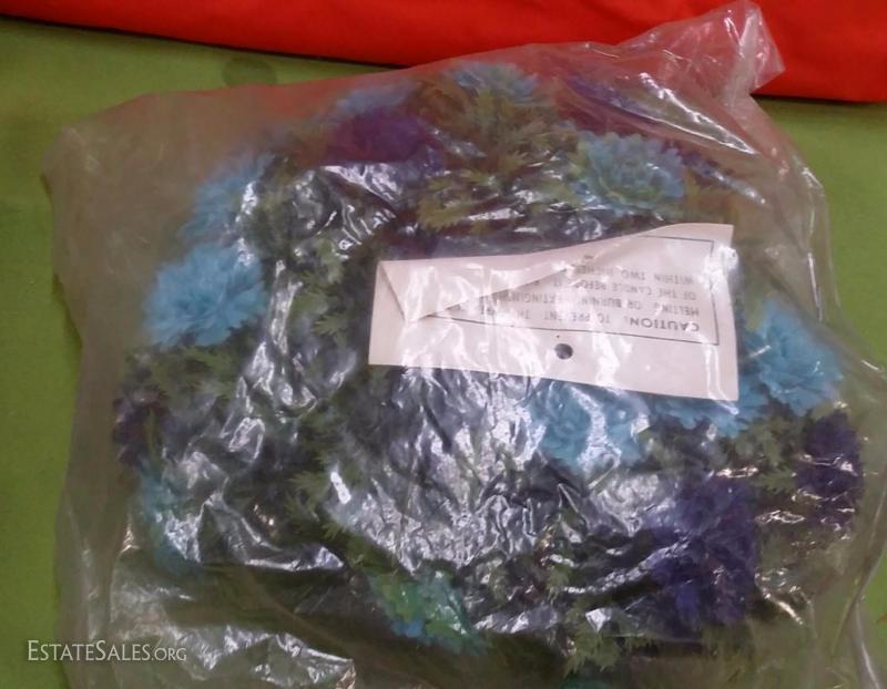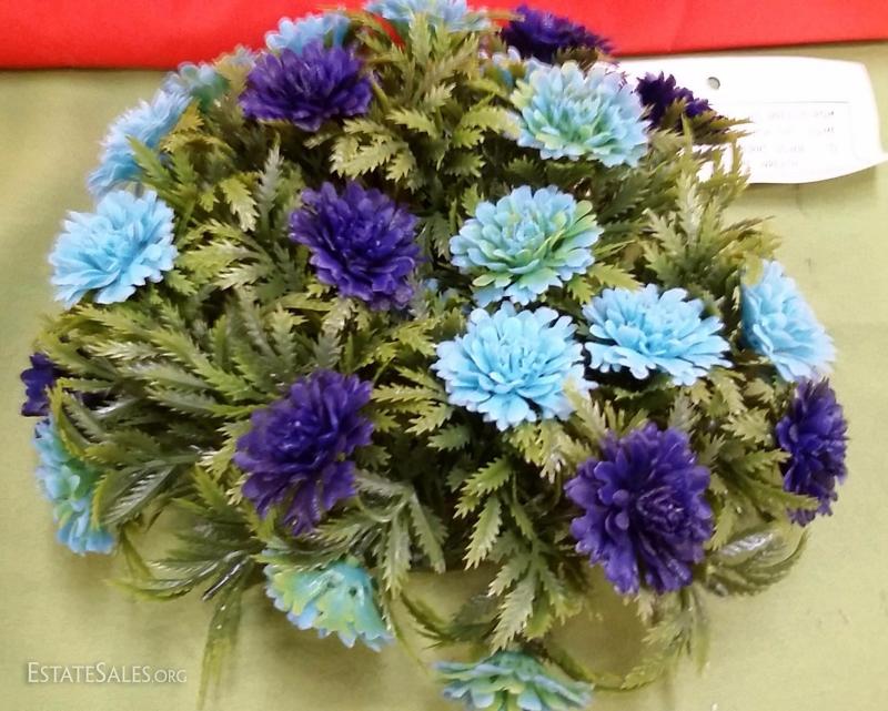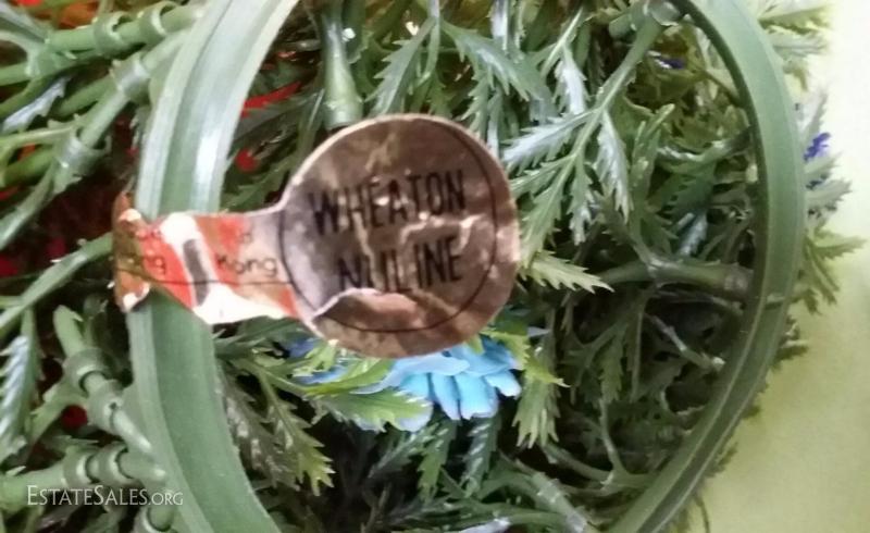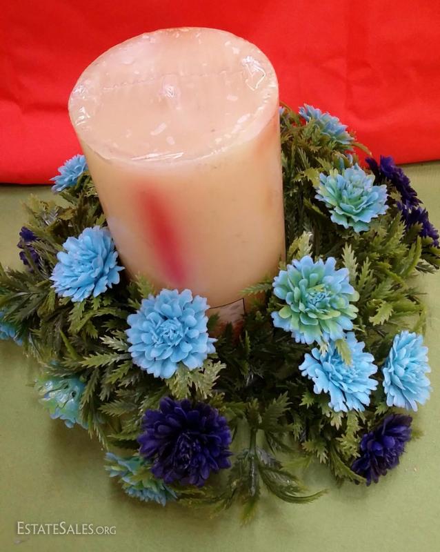 1950s Wheaton Nuline Plastic Fern with light and dark blue Foliage Pillar Candle Ring approx. 10 inch diameter with 3 in diameter hole for candle. There is a tag that reads Wheaton Nuline Made in Hong Kong. Removed from original bag to capture image. In age appropriate condition. Candle NOT included