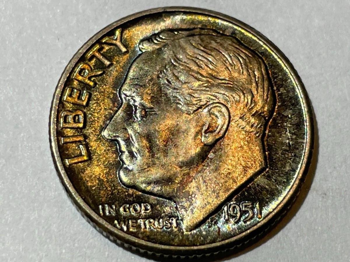 1951-P BU ORIGINAL TONED ROOSEVELT SILVER DIME FOR THE TONED LOVERS. $5 DOMESTIC SHIPPING. (On Multiple Lots Won the Shipping Fee will be Combined or Adjusted Accordingly)