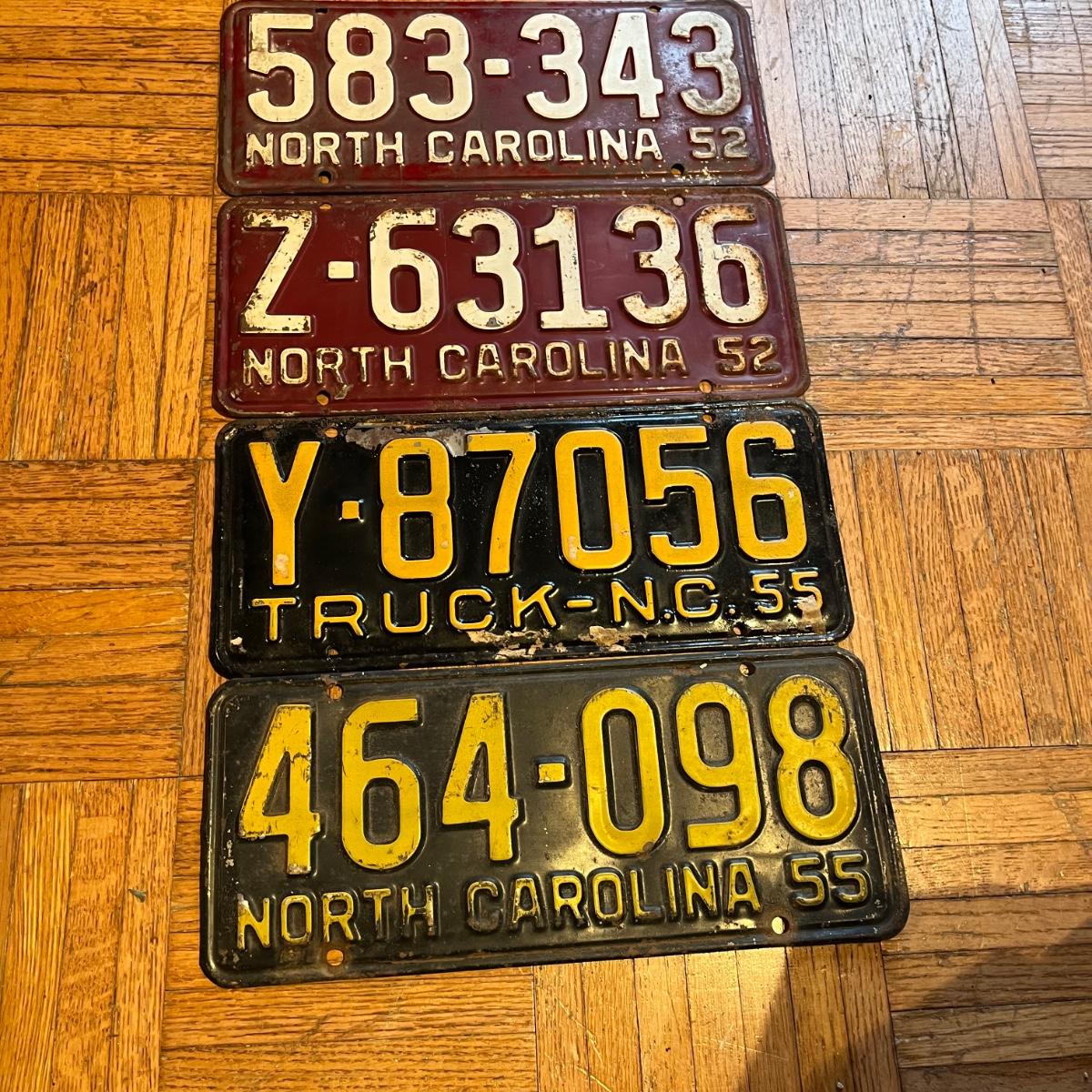 Lot includes two 1952 North Carolina License Plates. Also includes a 1955 North Carolina truck license plate and a 1955 North Carolina license plate.