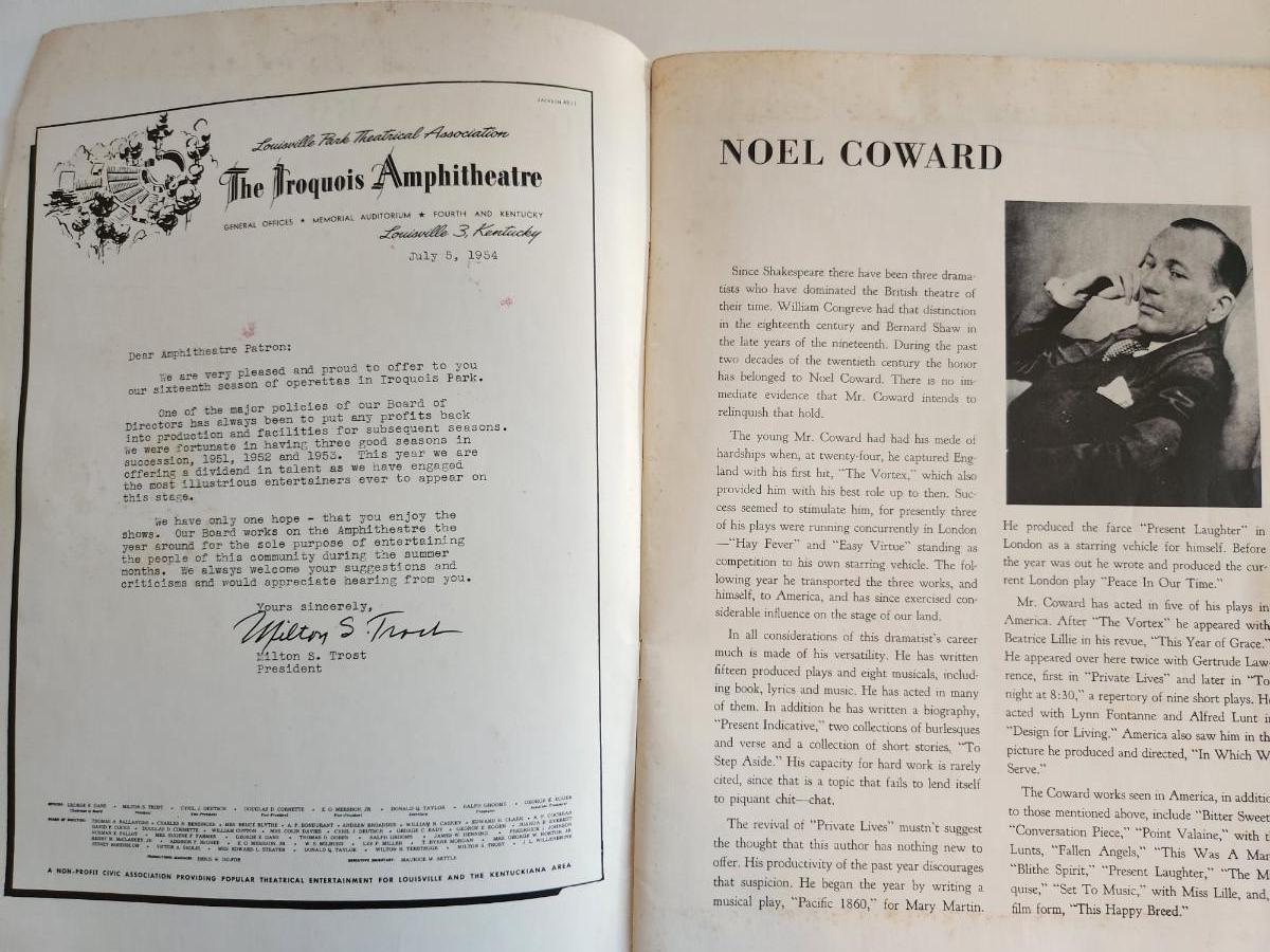 This auction lot is for a 1954 Iroquois Amphitheatre Program with an authentic Jeanette MacDonald Autograph. In Louisville, KY the Amphitheatre was THE place to see all the big name actors under the stars during this time. This is a program for the play entitled "Bitter Sweet". The program is in good condition for its age and storage.