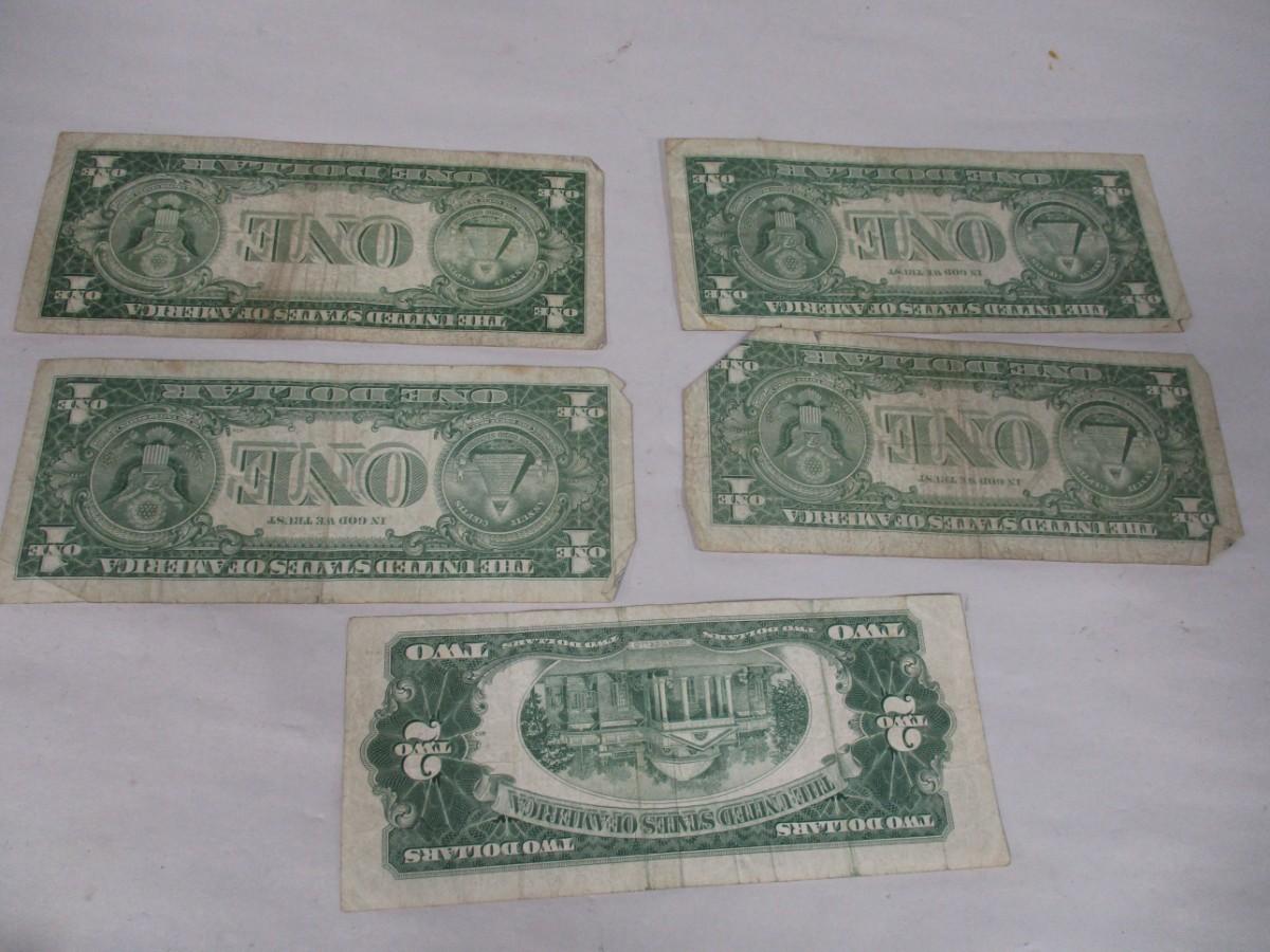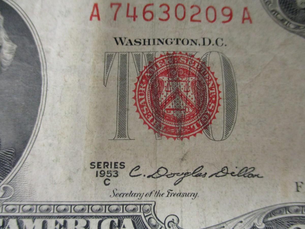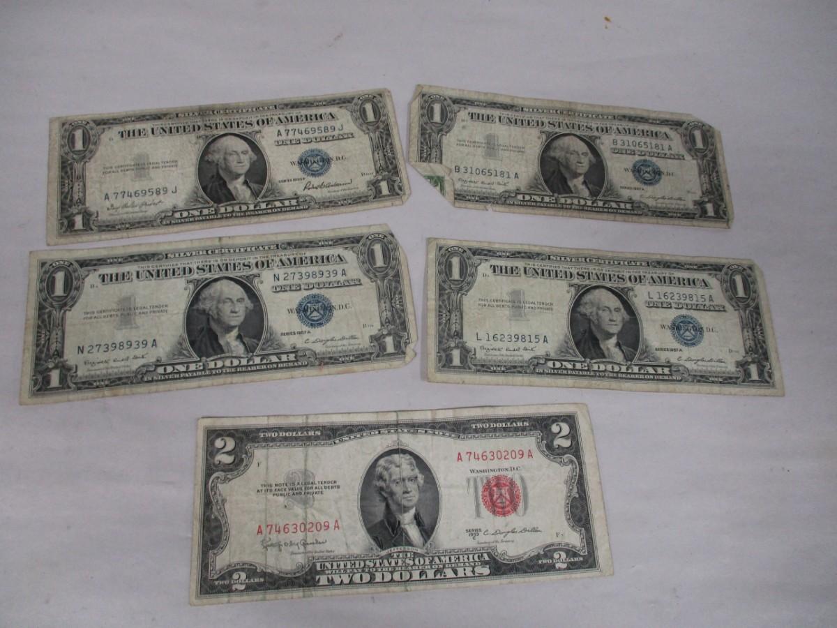 1955 1957 $1 One Dollar Bill Blue Seal & 1953 $2 Two Dollar Red Seal