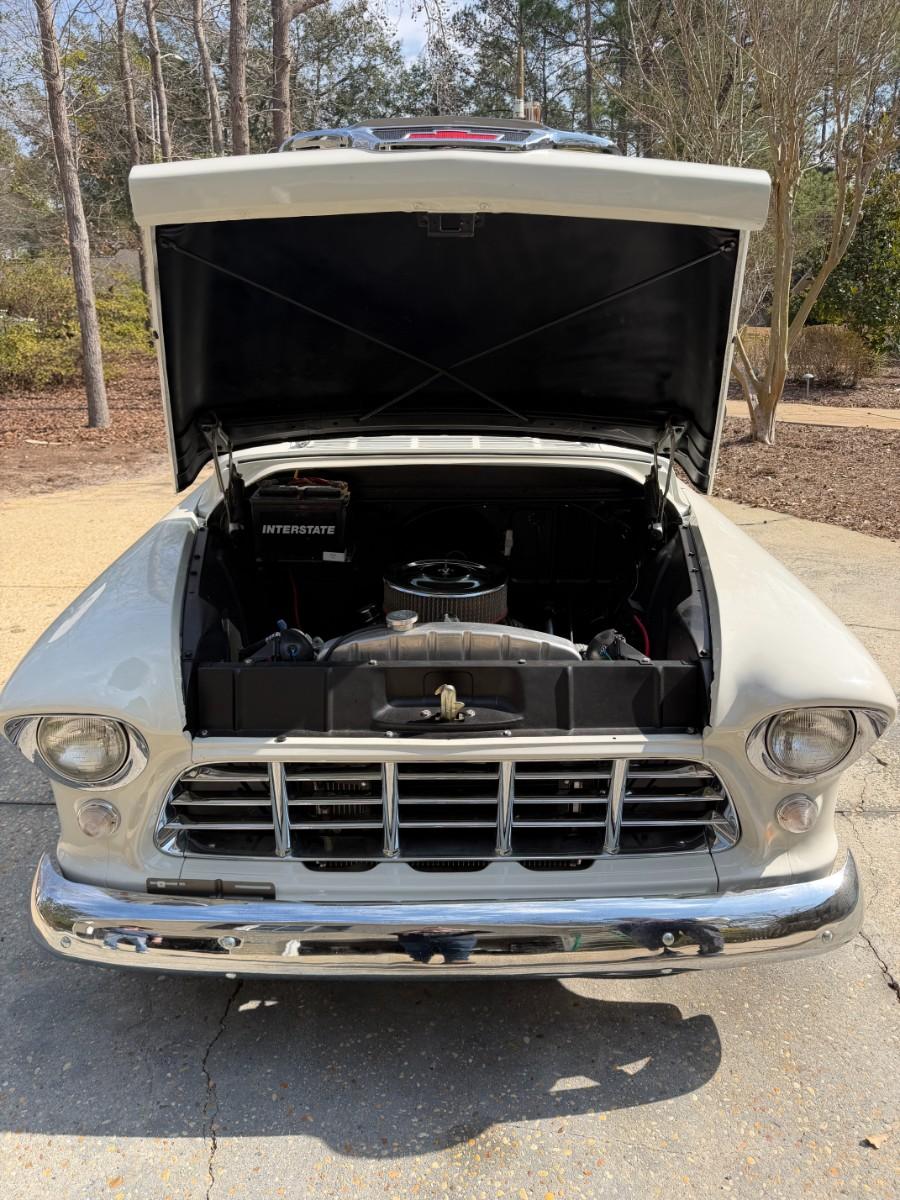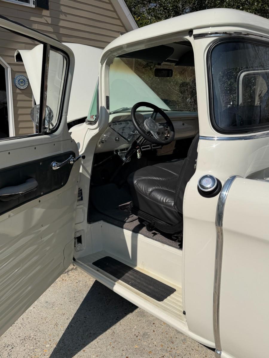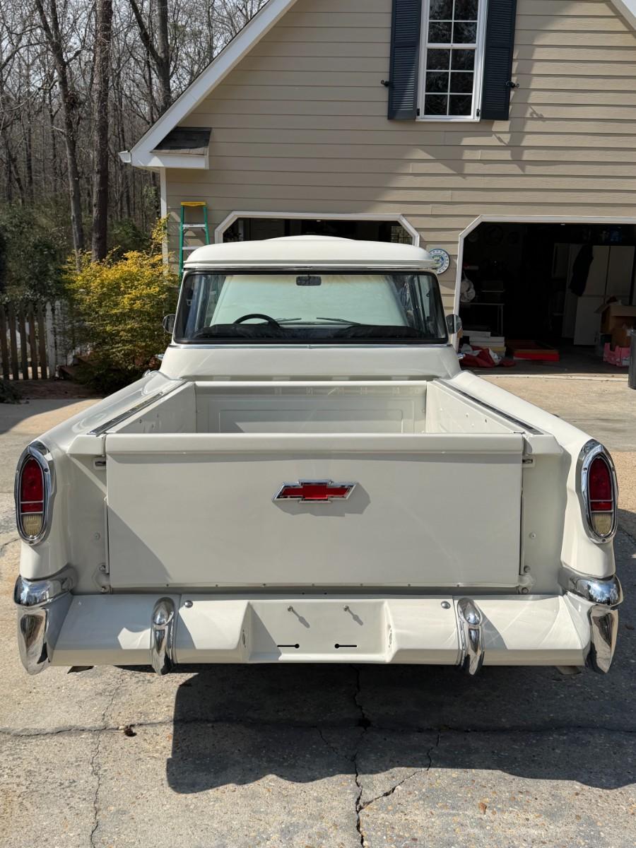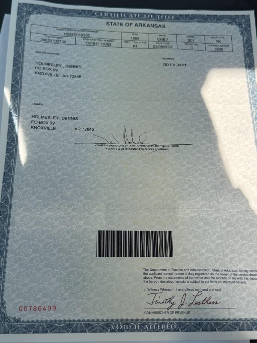 We have a fully restored 55 Truck for sale. Please see pictures as there is an original Title pictured. Truck was 100% restored from top to bottom by a business and not the owner. From rear end, decking, you name it, its restored. Vintage air has also been added. Truck can be seen in person during our upcoming estate sale on February 26th - 28th. We will have it available by appointment only outside of those days. Owner also purchased red interior for the truck, so that will come with the truck as well. There is nothing that has to be done to this truck. You could drive it across the country if you wanted to. The owner has told me a 350 from a 1966 Corvette is what is under the hood.