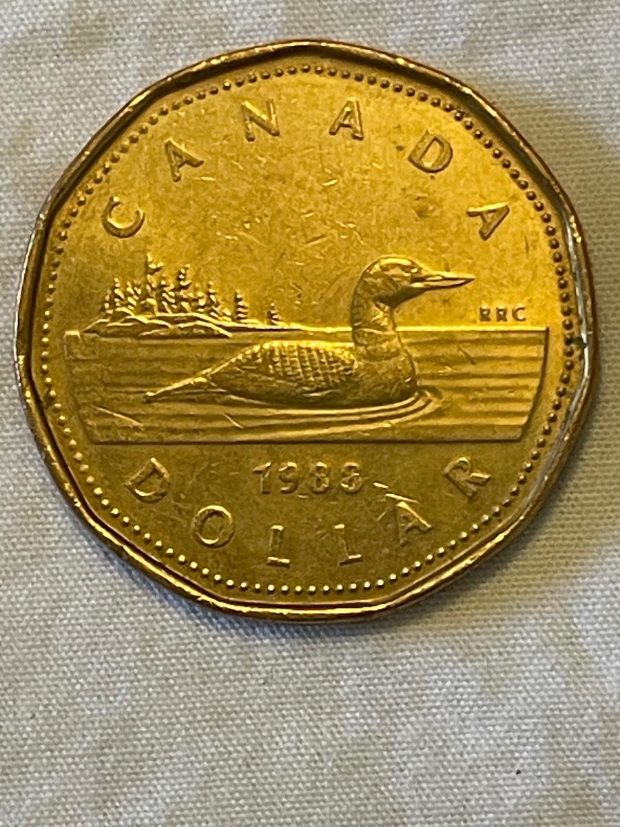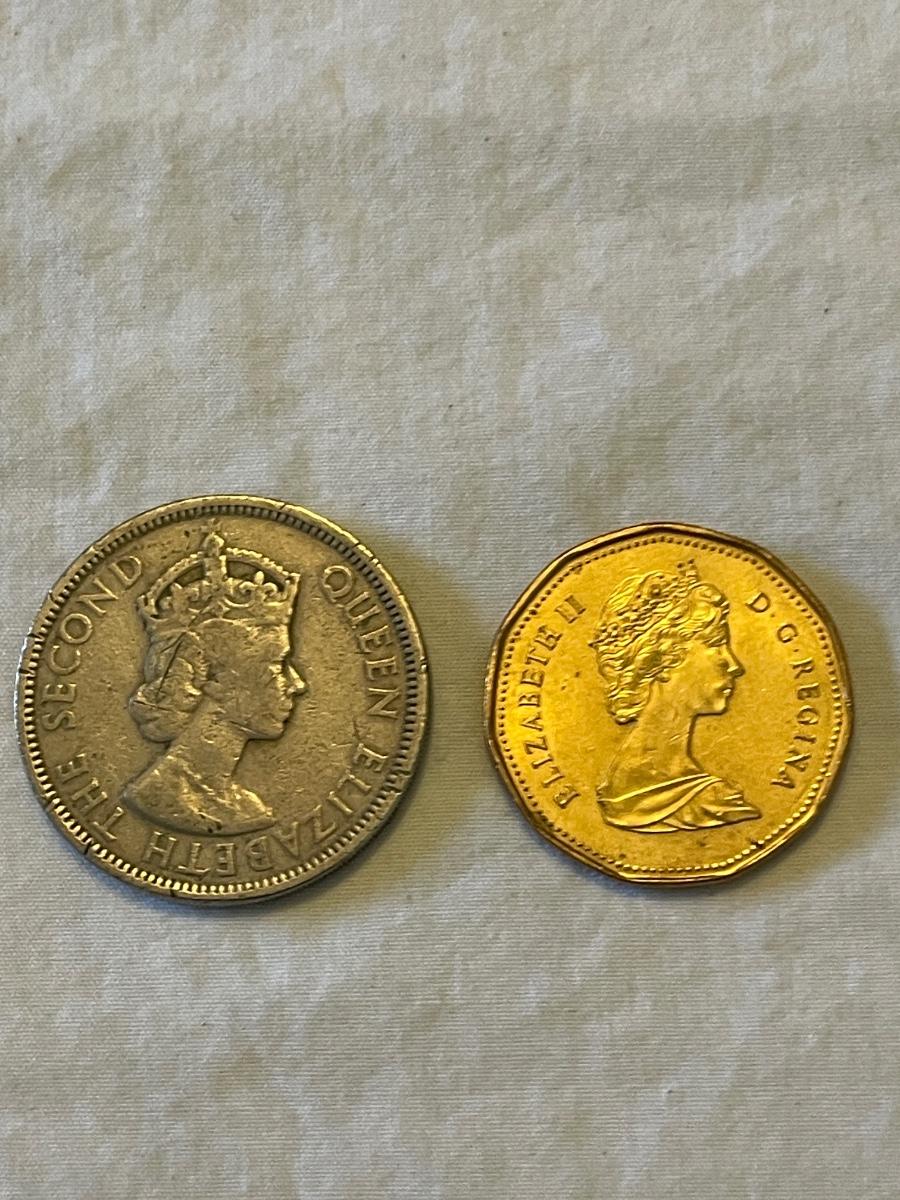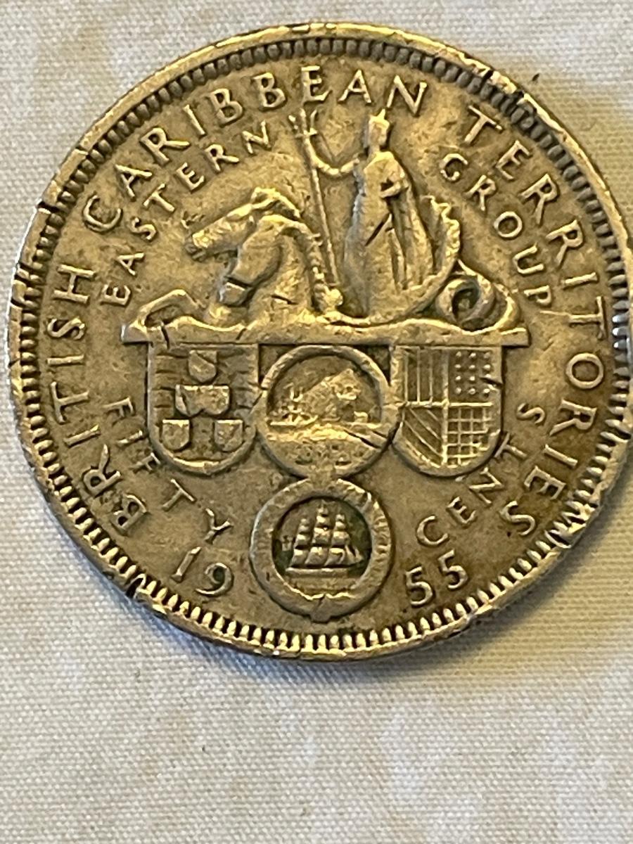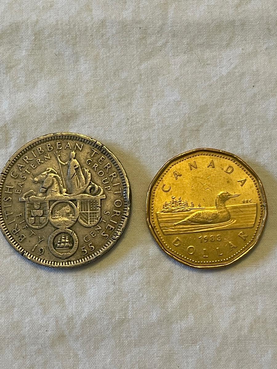 1955 EASTERN CARIBBEAN STATES 50 CENT COIN. 1988 CANADIAN “LOONIE” ONE DOLLAR COIN