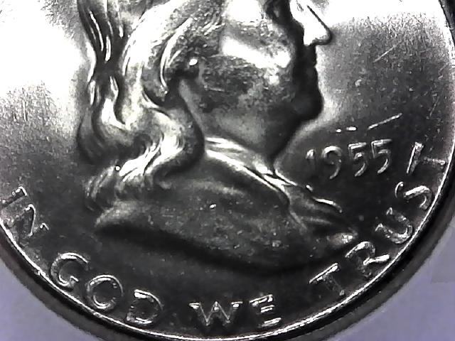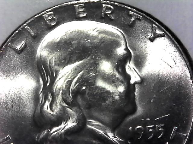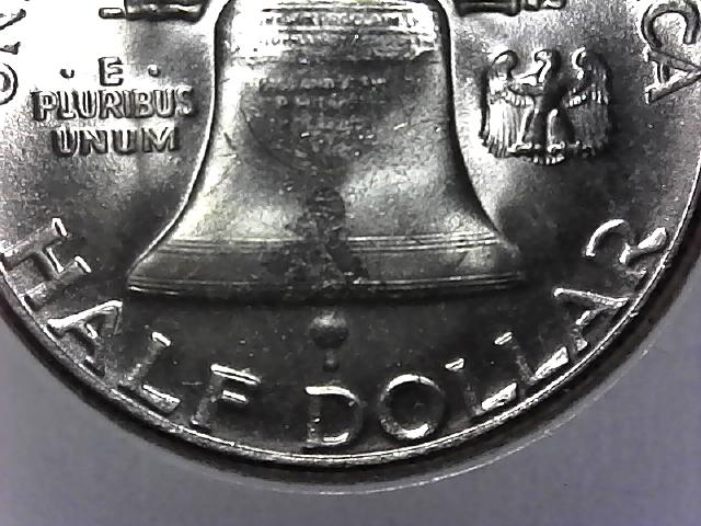 1955-P Franklin Silver Half Dollar Fine Quality Coin obverse has some wear on high points but distinct lettering. Good pinwheel effect.. Reverse has less wear but does have scratch at bell crack and one slightly above the bell rim.