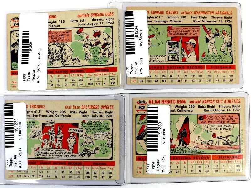 1956 TOPPS BASEBALL CARDS SET OF 4 - #74 #75 #80 #82 - EX - VGX