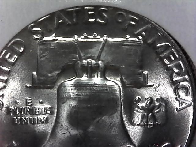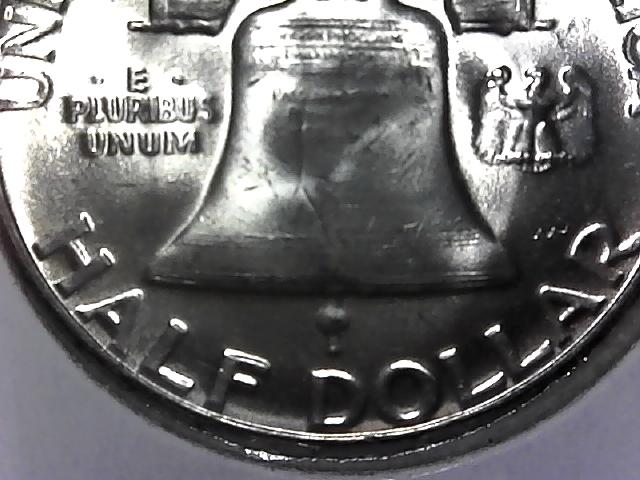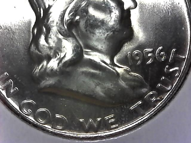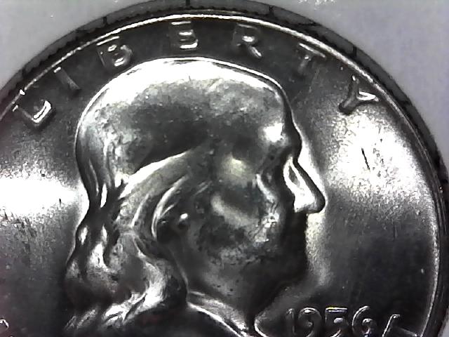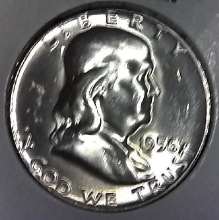 1956-P Franklin Silver Half Dollar Fine Quality Coin. Obverse has rubbing at cheek and along jaw line but nice distinct lettering and ridge line. Reverse. has minimal scratches and slight wear at the lower portion of bell rim.