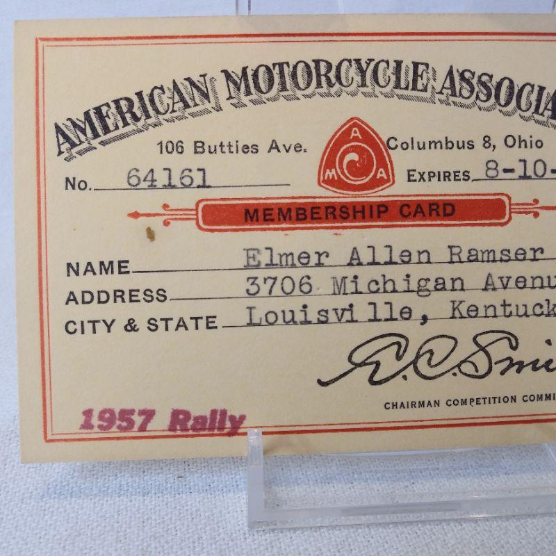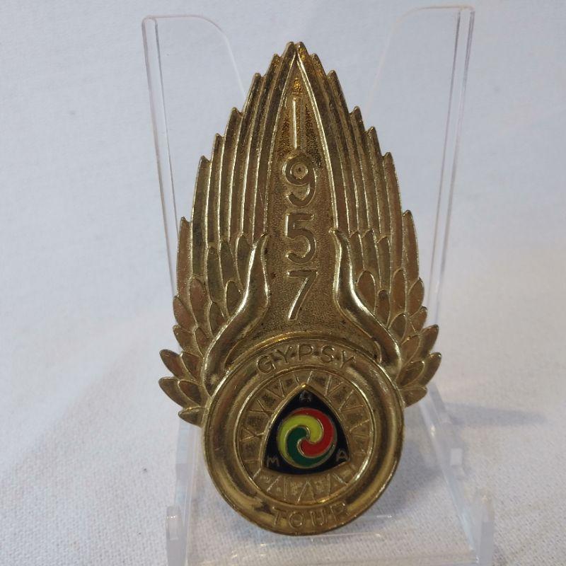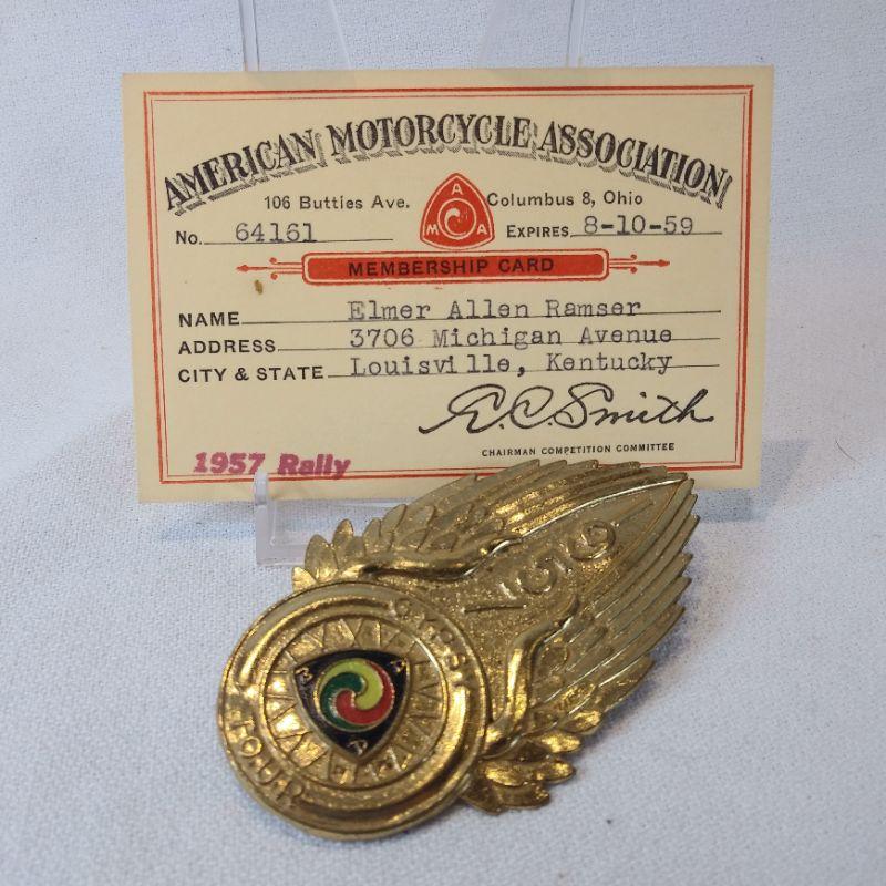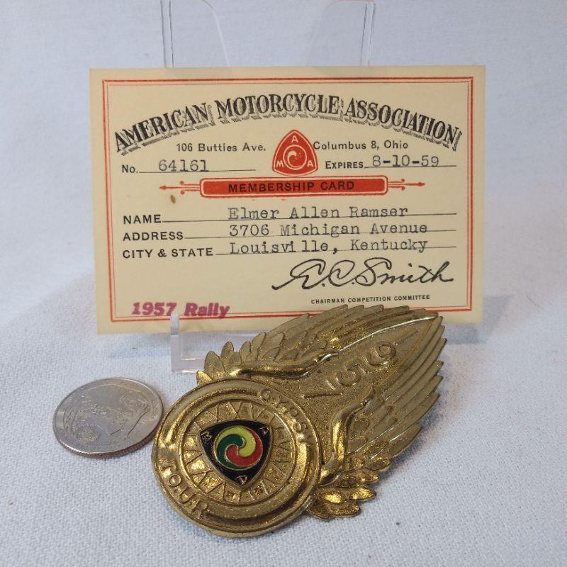 1957 AMA Gypsy Tour Metal Pin and Membership Card. Both are in very good condition. This offering is a wonderful example of the vintage motorcycle items now being sought by knowledgeable collectors and resellers. This is a 1957 AMA Gypsy Tour Metal Pin and 1949 Membership Card. Pin shows very light wear - he worn it across the country on his leather cap aboard his Harley - but card is very good. Starting Bid/Reserve is $15.
