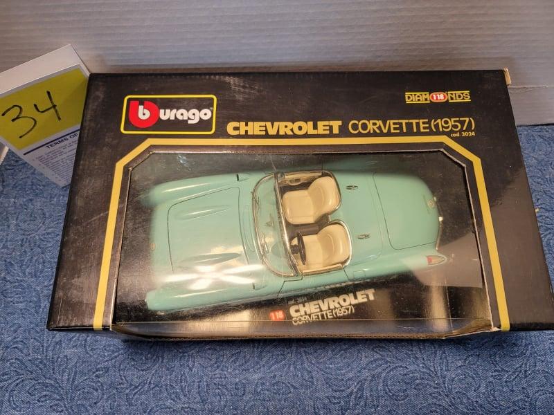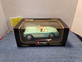 Box is good car is great. Teal & White 1957 1:18 Die cast corvette by burago