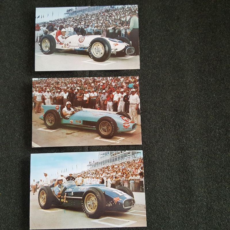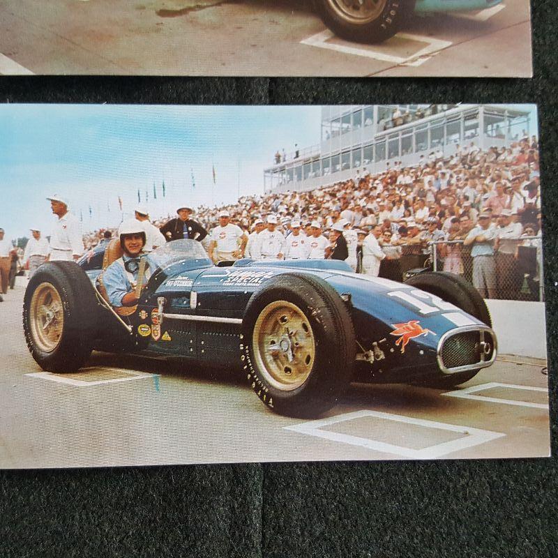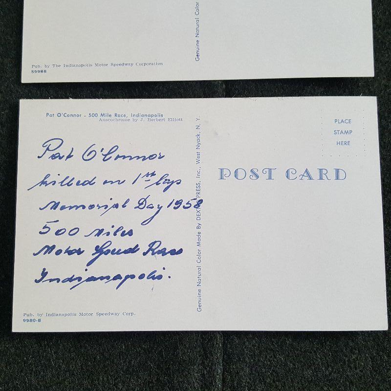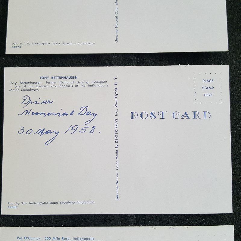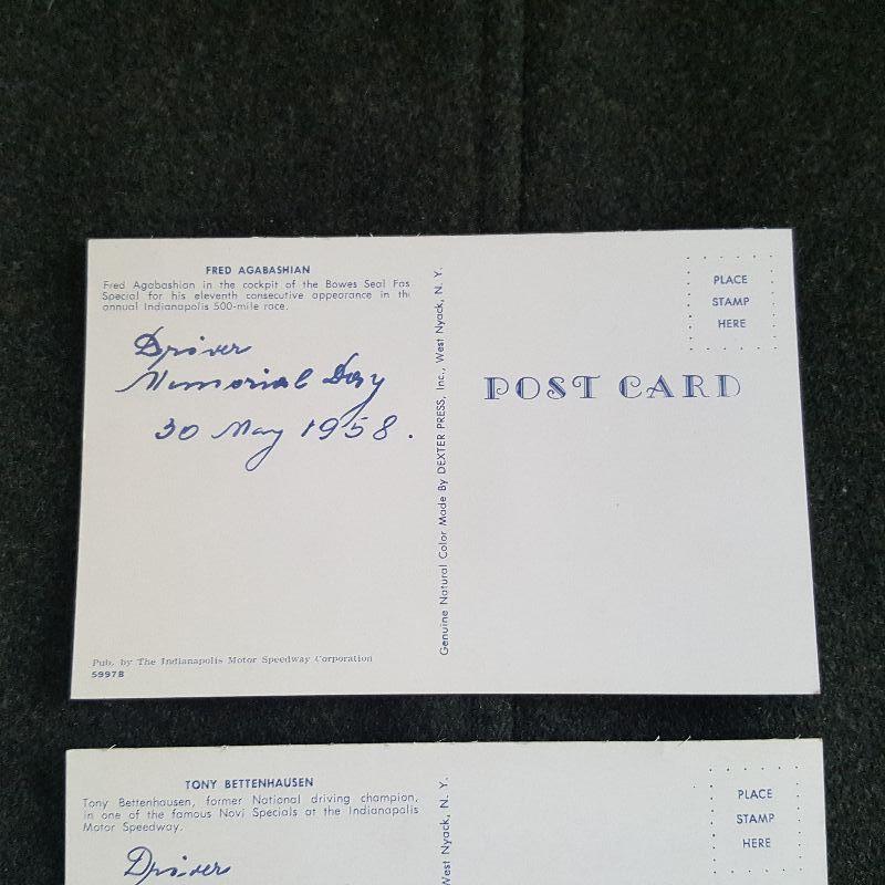 This auction lot is for a collection of 3 postcards. These 1958 Indianapolis 500 Memorial Day Race Souvenir Postcards are in very good condition. They show Tony Bettenhausen, Fred Agabasshian and Pat O'Connor. The Pat O'Connor postcard has a note written on the back that he was killed in the 1st lap of the Memorial Day 1958 race. What a souvenir. Ready sports fans! Start Your Engines - bid now and bid high!