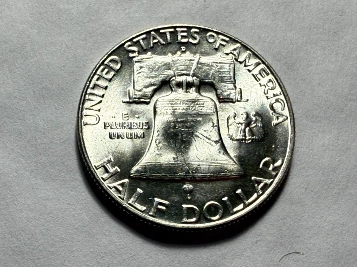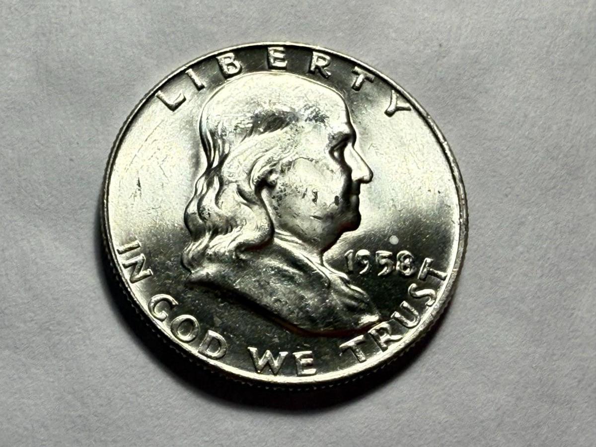 1958-D UNCIRCULATED CONDITION SILVER FRANKLIN HALF DOLLAR AS PICTURED. $5 DOMESTIC SHIPPING.