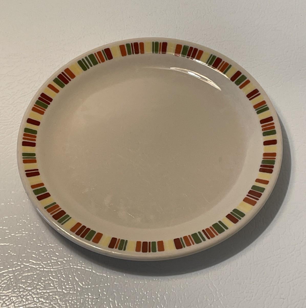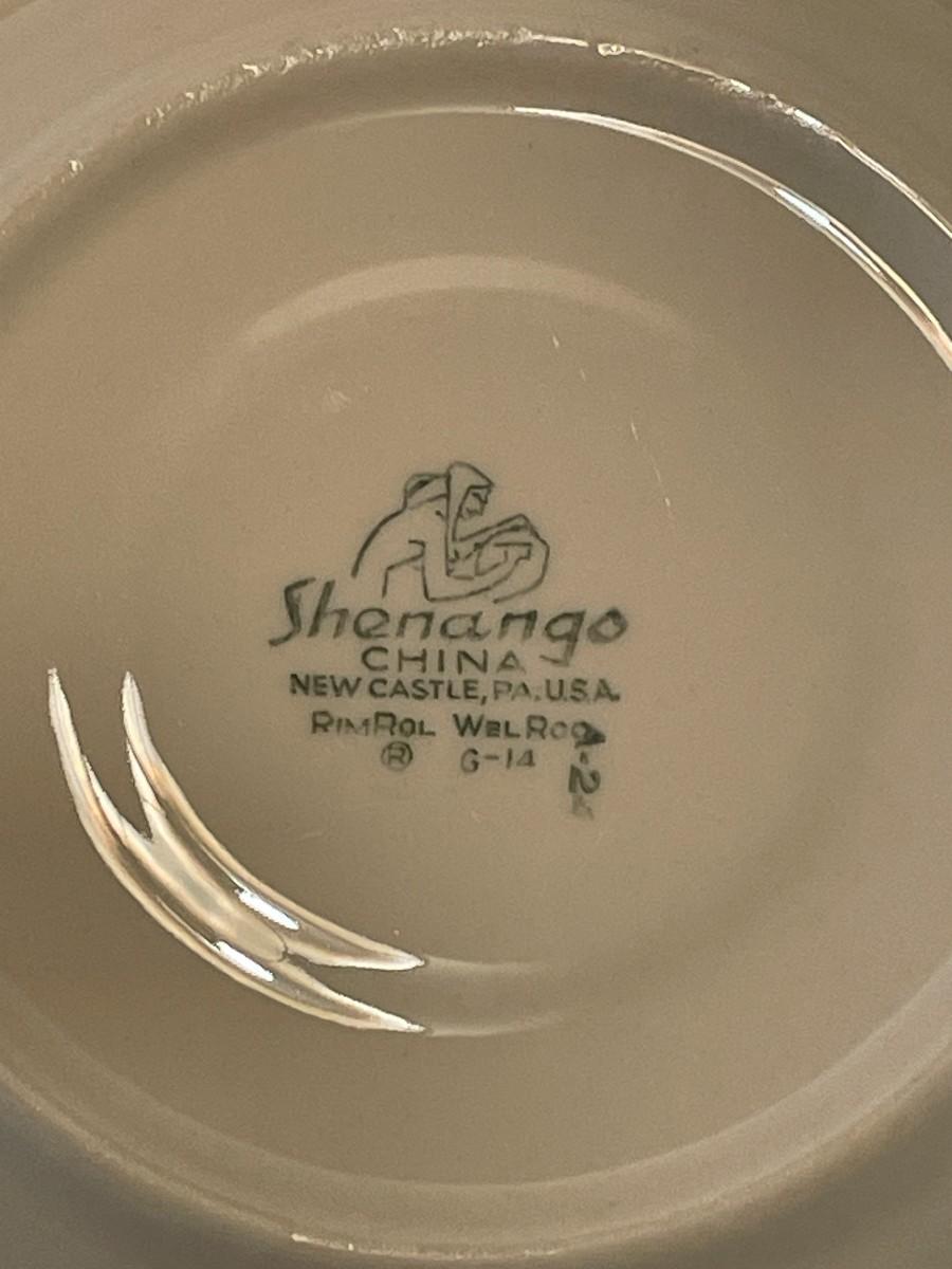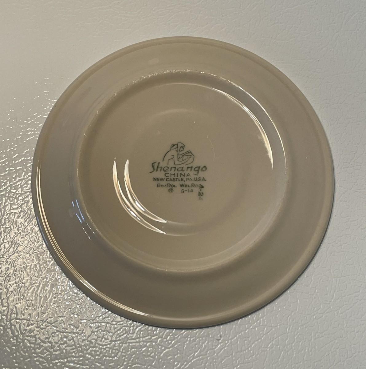 This side plate is about 6.25 inches in diameter and in very good condition. Made by Shenango China around 1959.