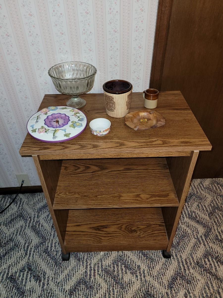 Table measures 28" tall, 23.5" wide and 15.5" wide. The items on top are a candy dish, old ashtray and some ceramics and the tiniest level ever