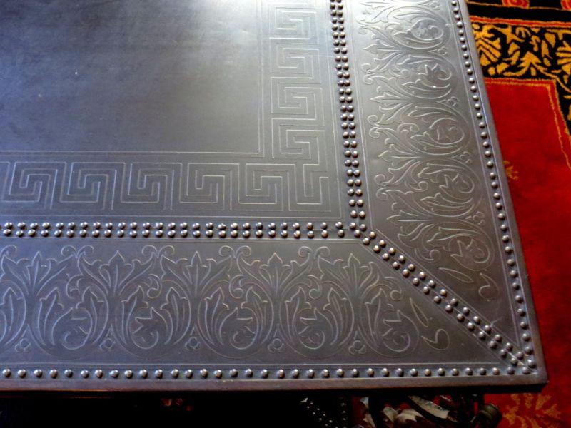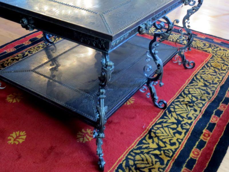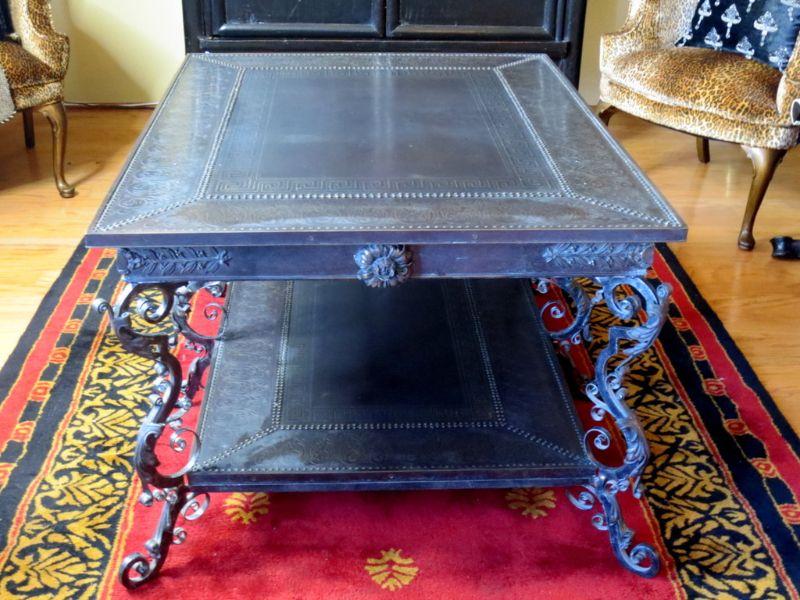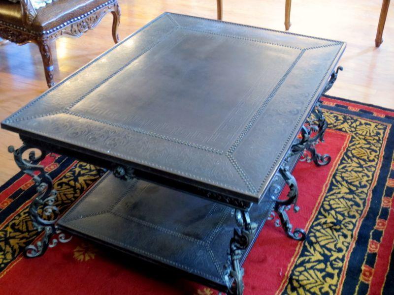 This is much nicer in person and the photos do not show just how awesome this cocktail table truly is. It is a heavy & solid metal table that is 40" wide x 31" deep x 23" tall.
