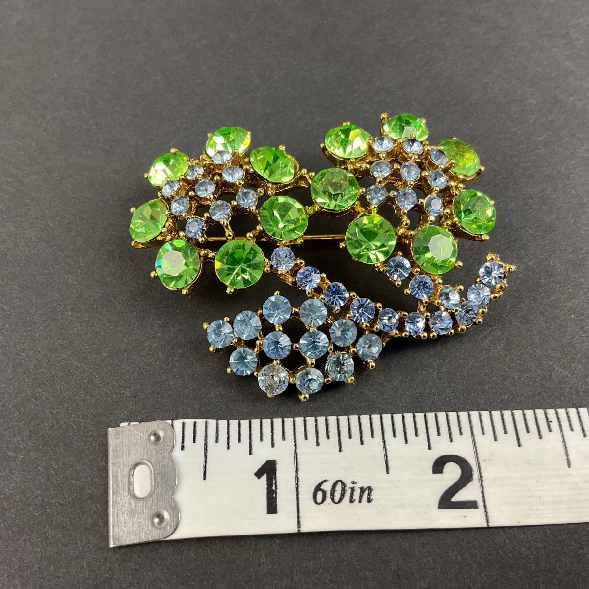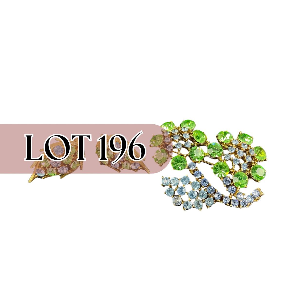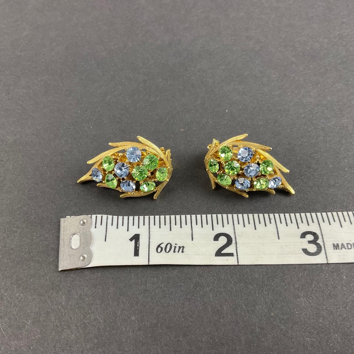 One vintage Lisner green and blue rhinestone brooch and earrings. Some rhinestones are Uranium glass. Please see photos for details and condition. Any condition statement is given as a courtesy to a client, is an opinion, and should not be treated as a statement of fact. Reference to condition written, oral or within a condition report shall not be regarded as a full account of condition and may not include all defects, alterations, or restorations. Absence of a condition report does not imply a lot is flawless or lacking imperfections or damage. Katherine’s Auction & Appraisal Service shall have no responsibility for any error or omission. Returns shall not be accepted on the basis of condition. ::: Shipping is available on this lot. If you require shipping you must let us know at the close of the auction. We will coordinate with you after the item has been won. Shipping fees will include insurance up to or exceeding the value of all items being mailed. If you have any questions regarding this lot please contact the auctioneer either via this website, by direct email or by phone. PICK UP TIMES and other important information can be found in the TERMS and DESCRIPTION of the auction. Please take a look for pertinent information. Thanks!