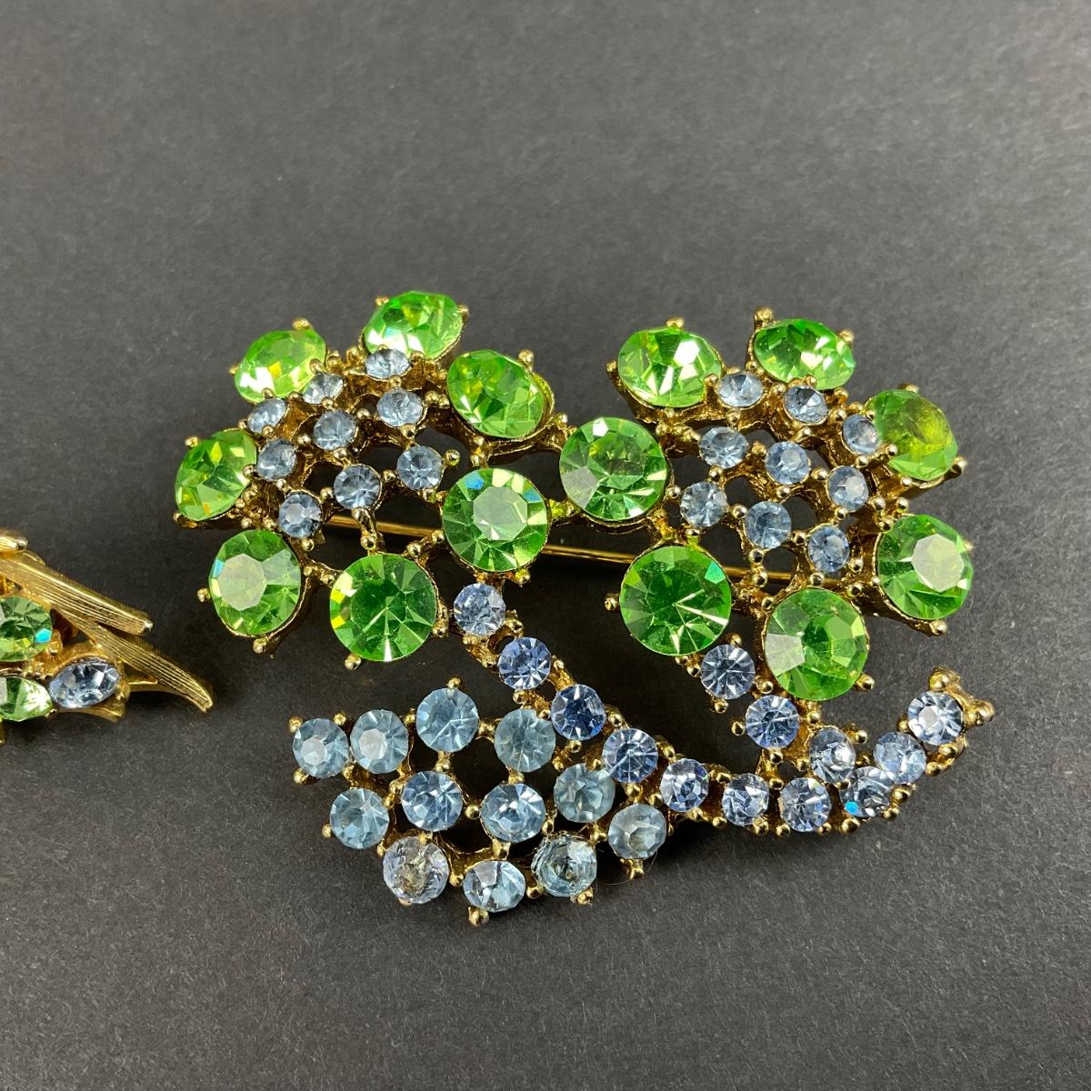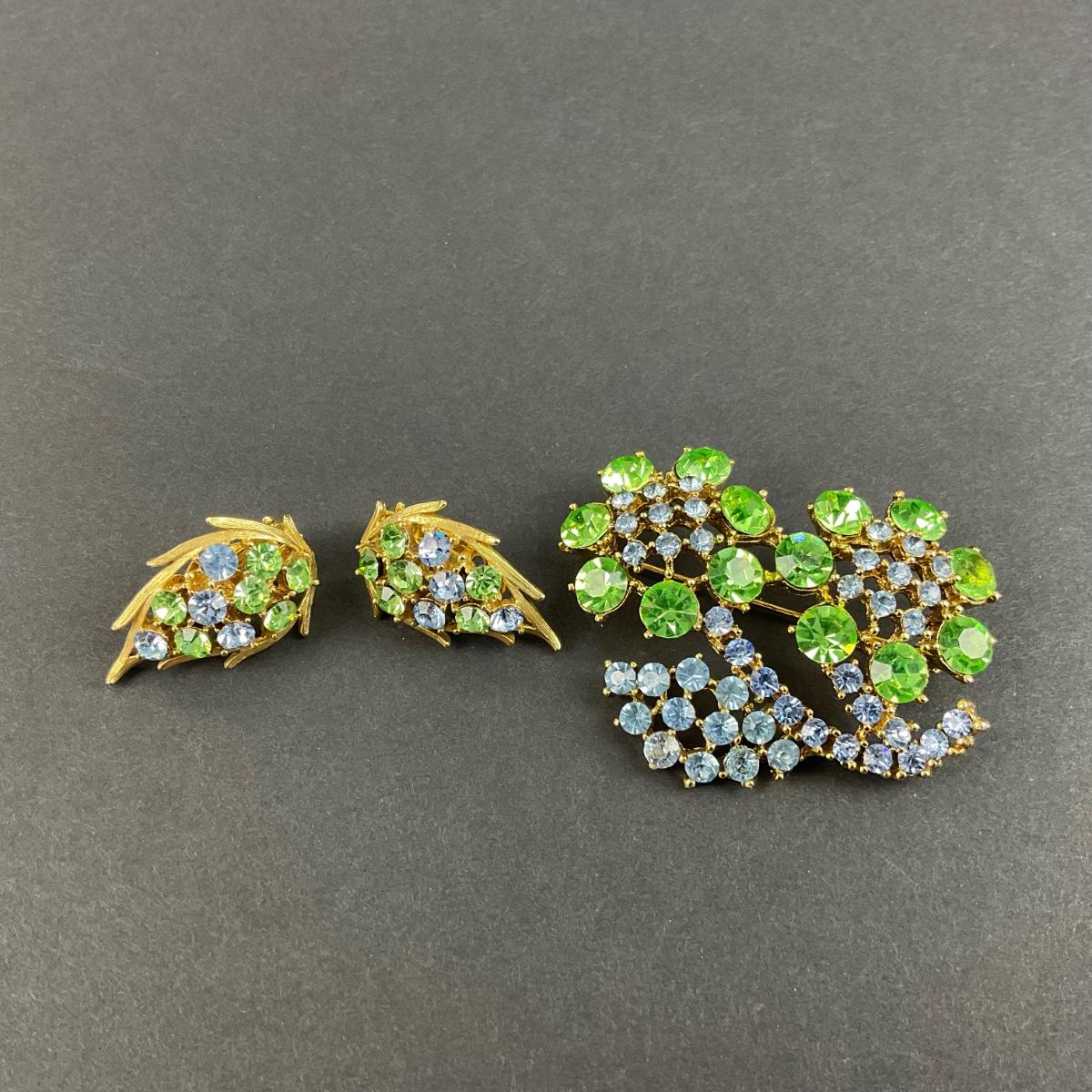 -196- LISNER | Uranium | Green & Blue Rhinestone Brooch & Earrings | Marked