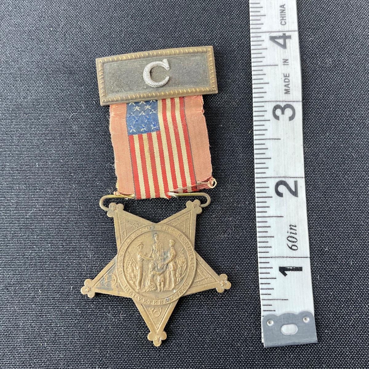 One grand army of the republic 1861 veteran 1866 top C bar medal. Please see photos for details and condition. Any condition statement is given as a courtesy to a client, is an opinion, and should not be treated as a statement of fact. Reference to condition written, oral or within a condition report shall not be regarded as a full account of condition and may not include all defects, alterations, or restorations. Absence of a condition report does not imply a lot is flawless or lacking imperfections or damage. Katherine’s Auction & Appraisal Service shall have no responsibility for any error or omission. Returns shall not be accepted on the basis of condition. ::: Shipping is available on this lot. If you require shipping you must let us know at the close of the auction. We will coordinate with you after the item has been won. Shipping fees will include insurance up to or exceeding the value of all items being mailed. If you have any questions regarding this lot please contact the auctioneer either via this website, by direct email or by phone. PICK UP TIMES and other important information can be found in the TERMS and DESCRIPTION of the auction. Please take a look for pertinent information. Thanks!