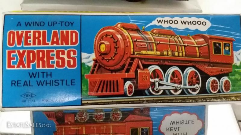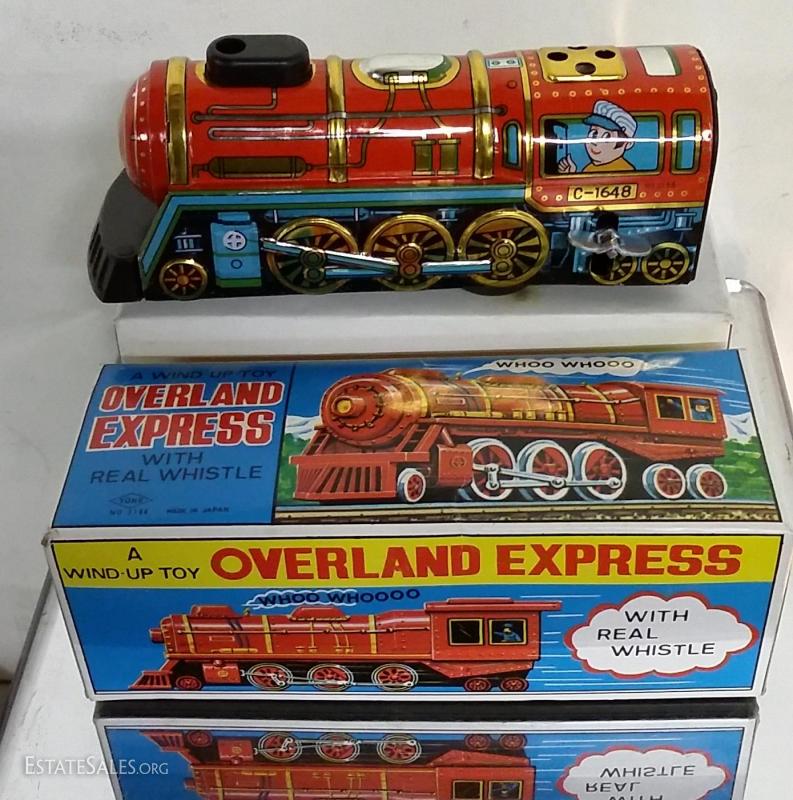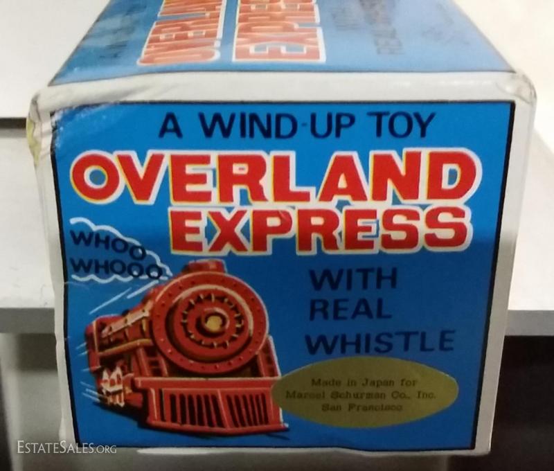 1960 Overland Express wind up train made in Japan for Marcel Schurman Company, Inc., San Francisco CA-A wind up train with attached key and real whistle sound! 6.5 x 3 x 2 inches. In original Box.
