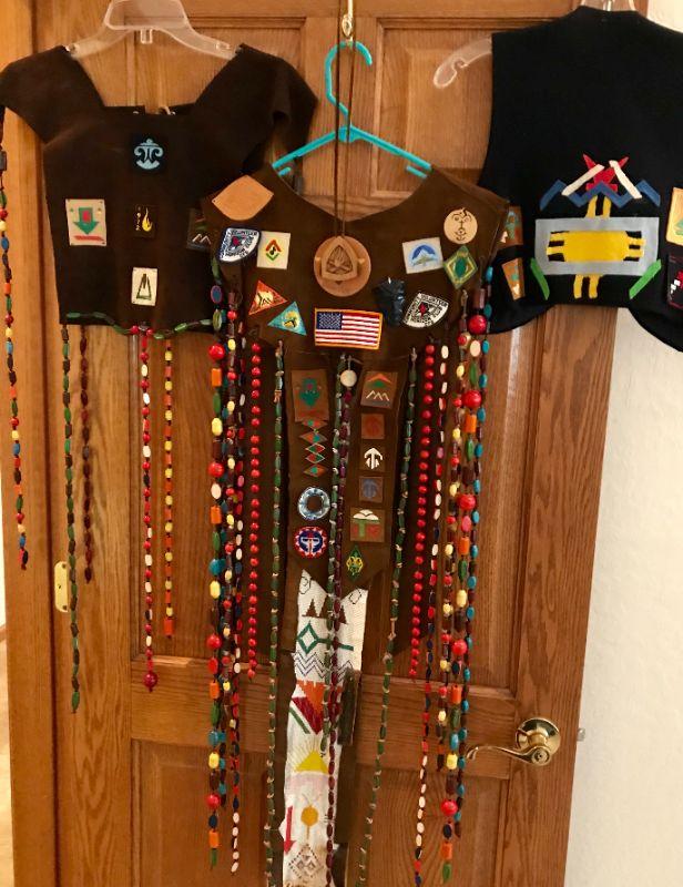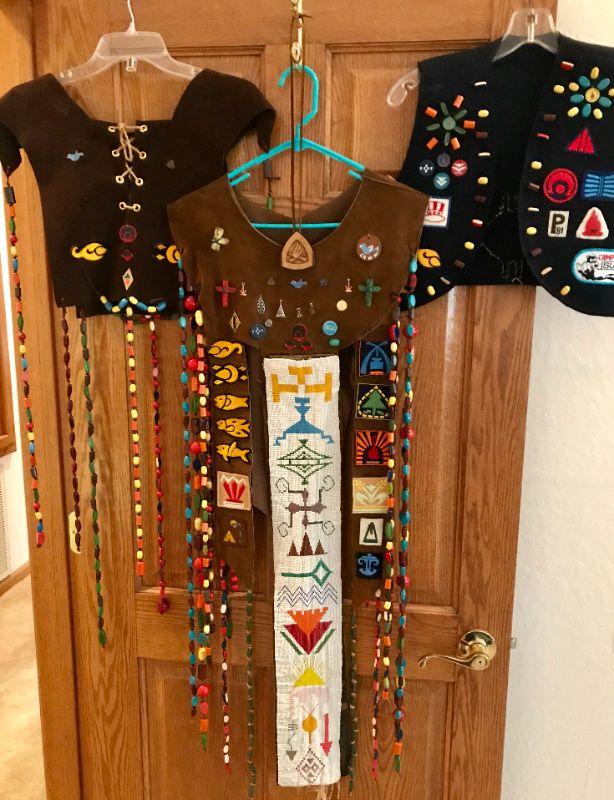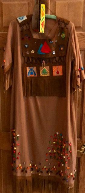 Beads and awards attached. Large white beaded section needs to be stitched, otherwise in good condition.