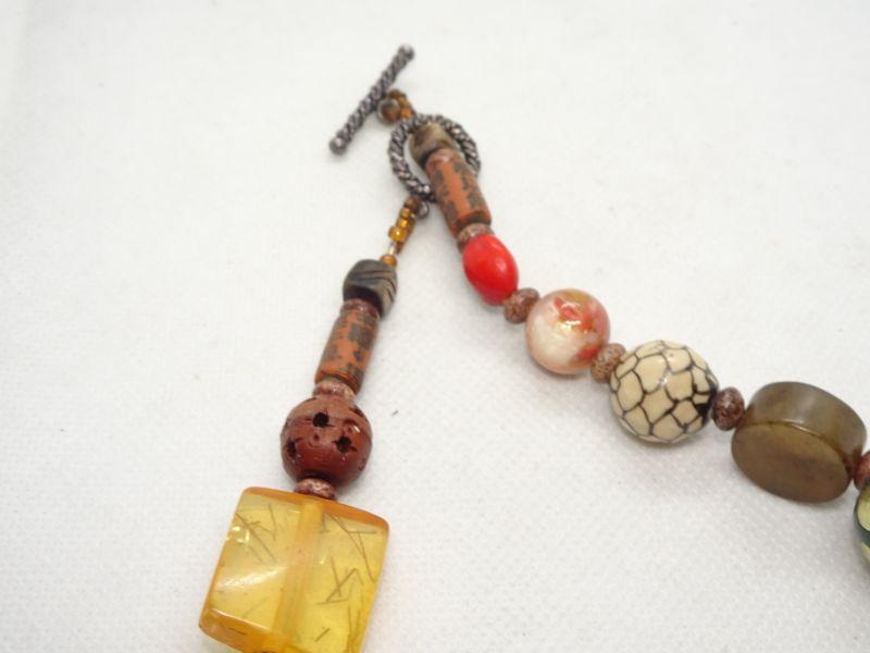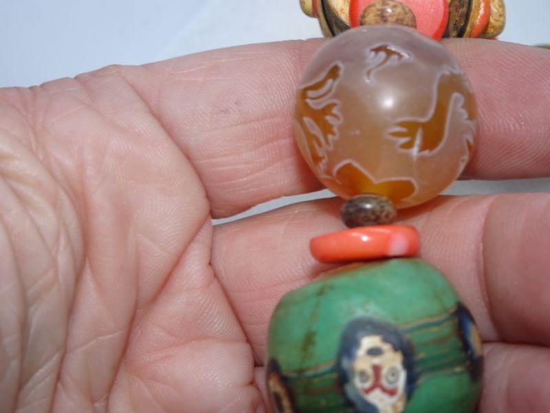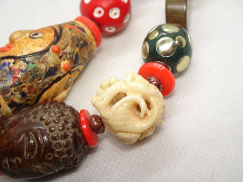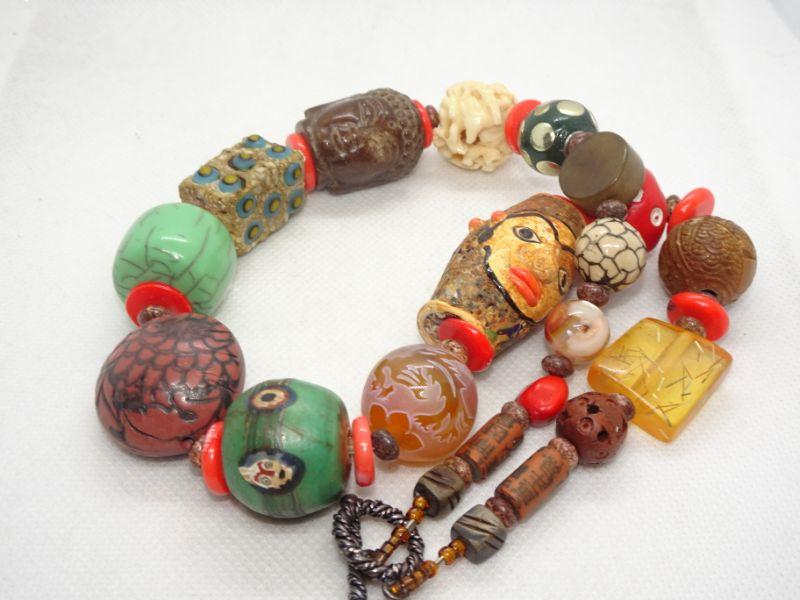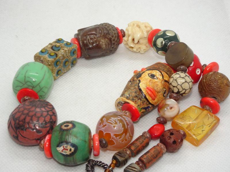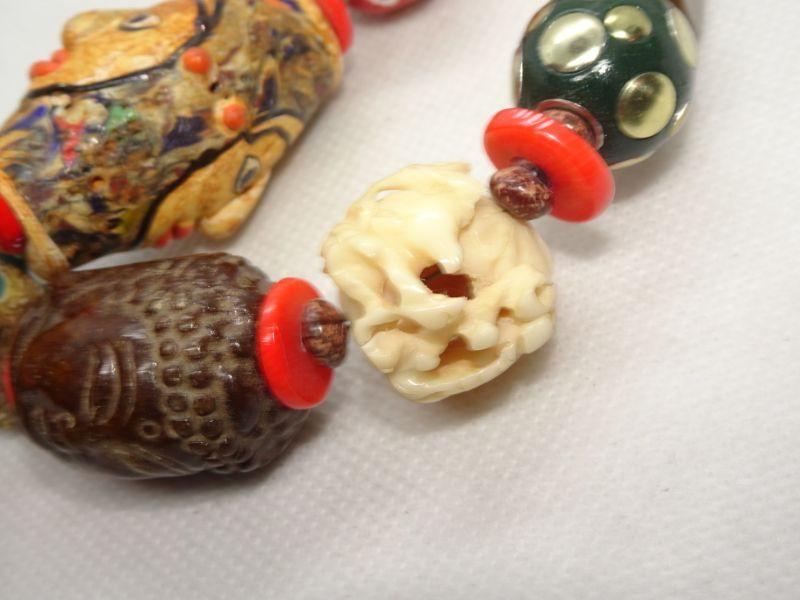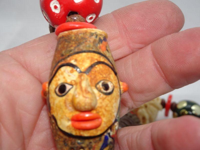 1960's Chunky Trade Bead Necklace, Tribal, 2-sided face, carved glass bead, Natural stone beads, Ivory colored bead