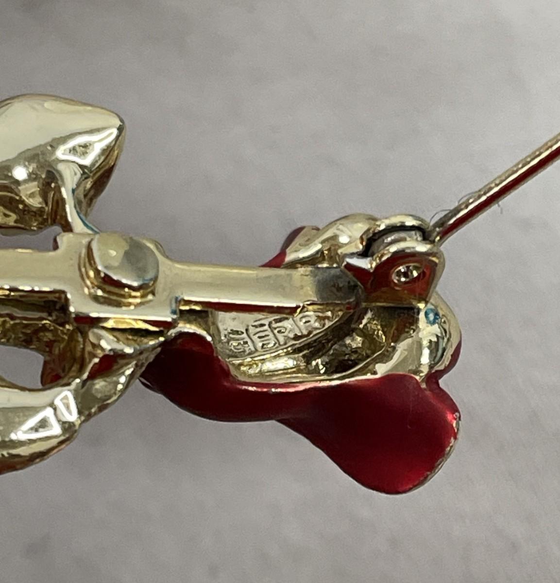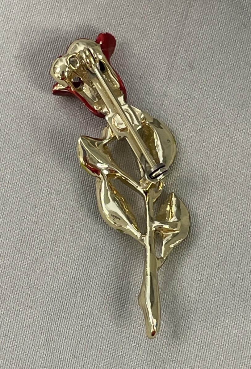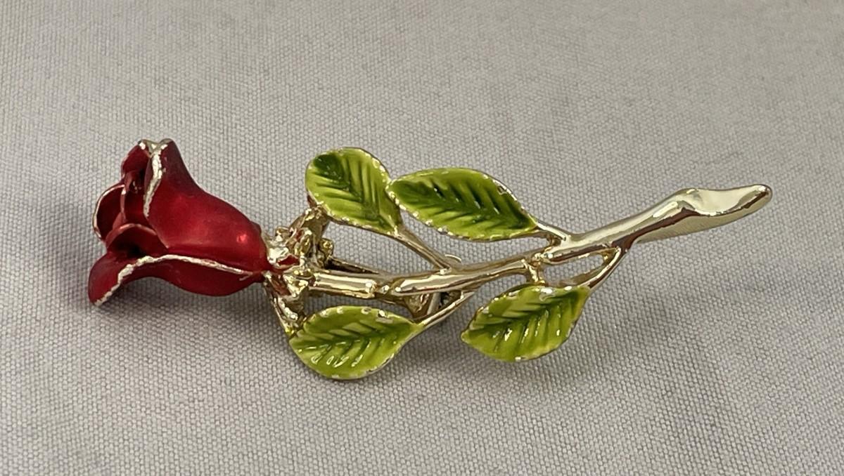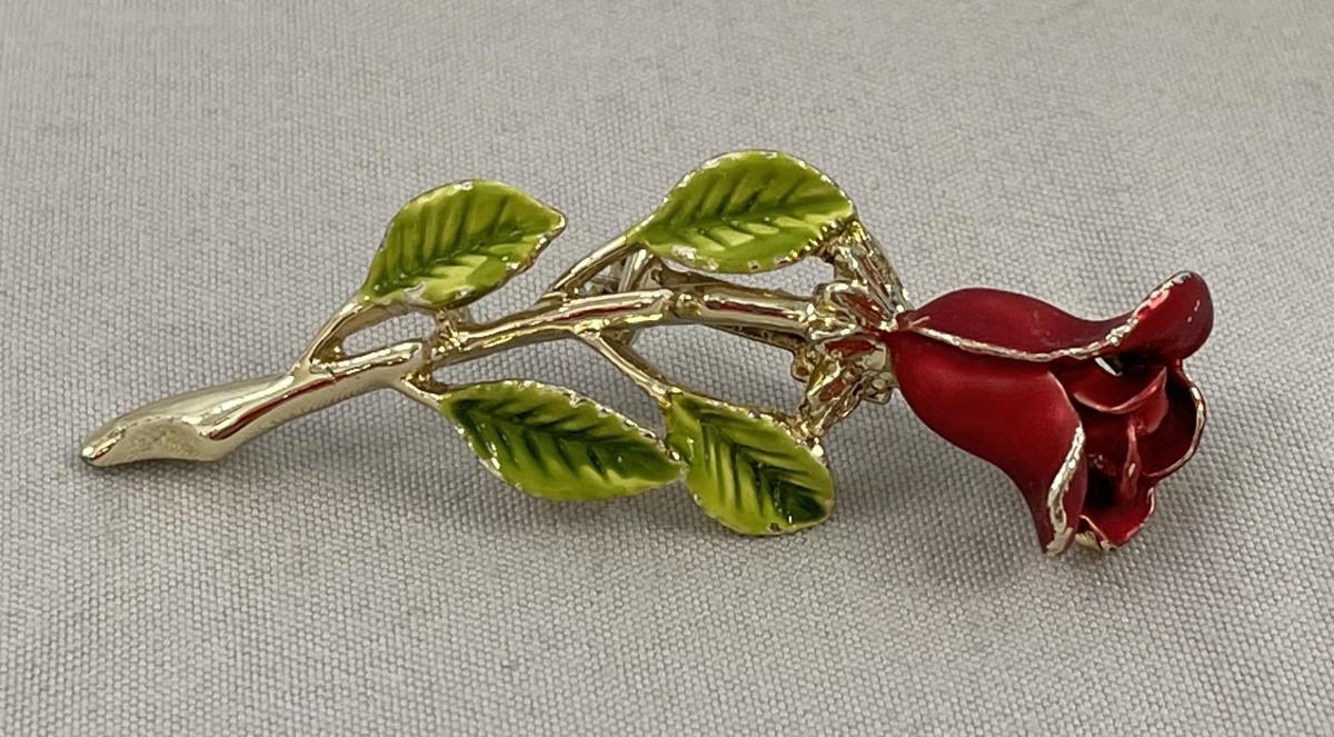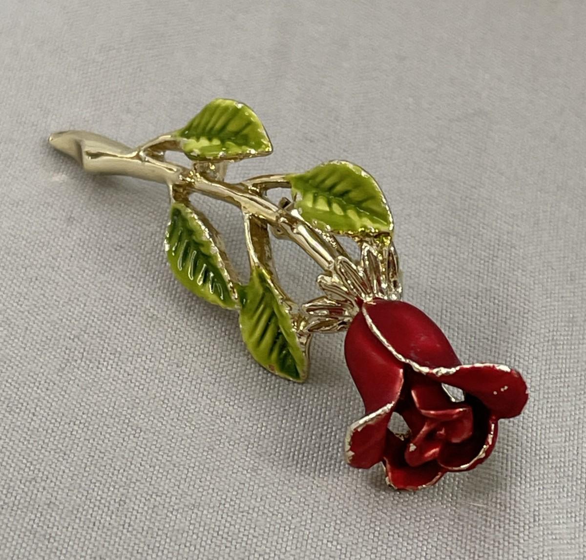 This pin is about 2 inches long and made of a gold colored metal with red and green enamel paint to embellish the rose petals and the leaves.