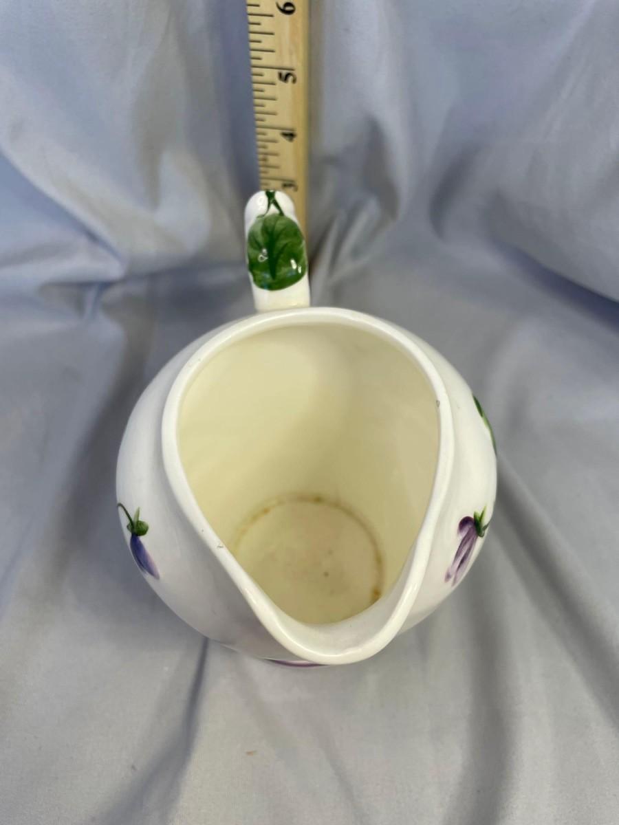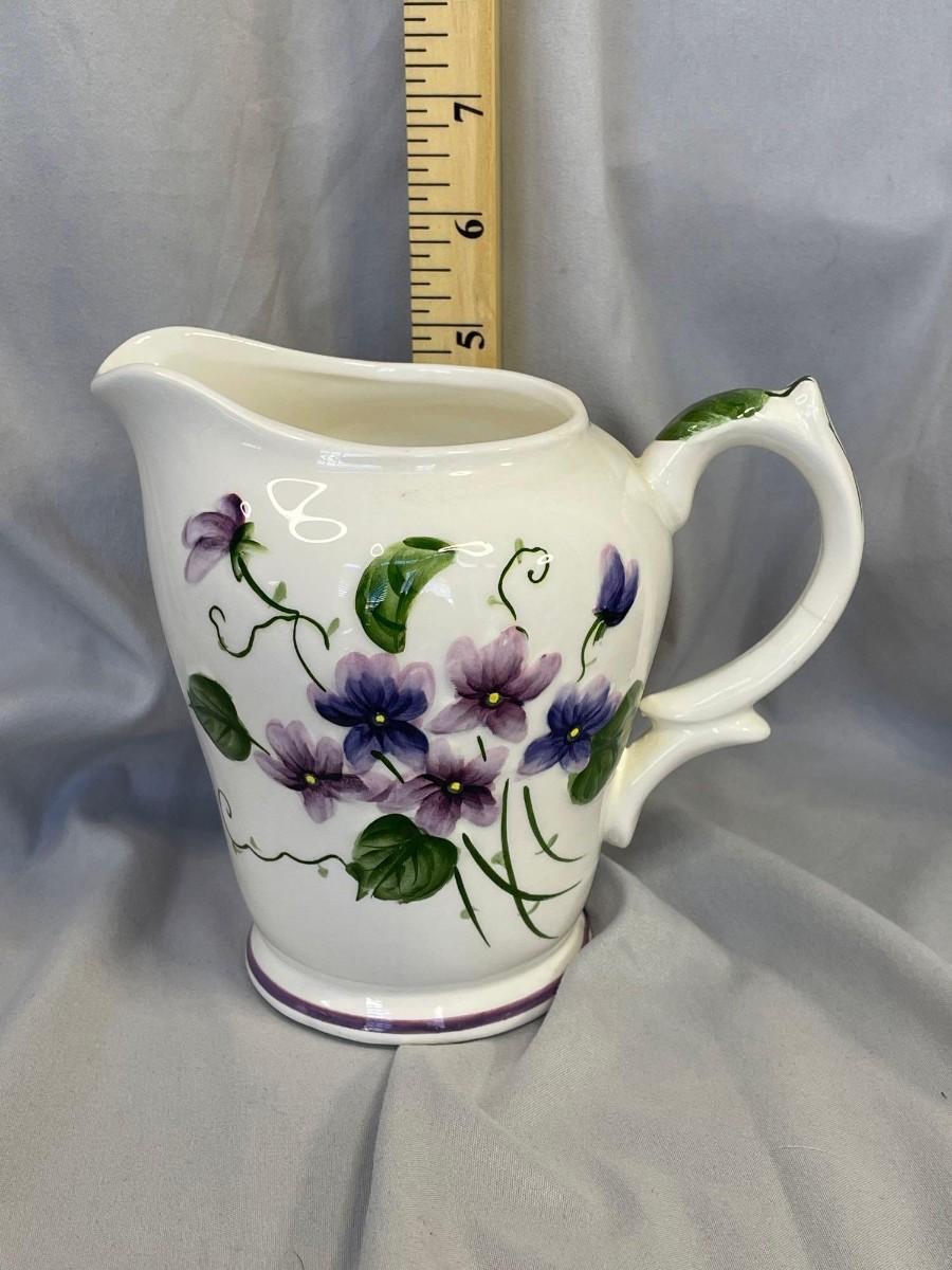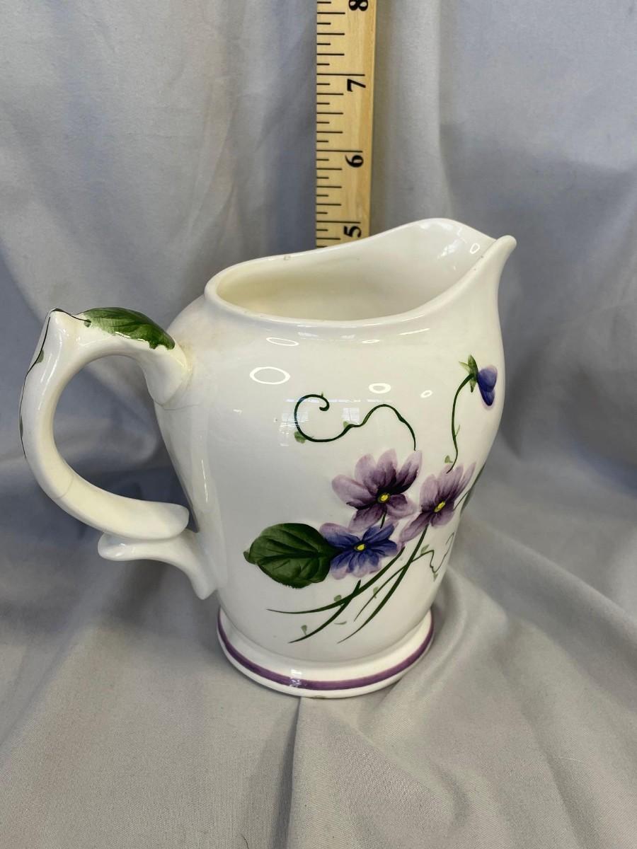 This pitcher is in excellent condition and the violets, leaves, and vines are all raised. Based on the red paper label, it was made between 1953-1971 and is free from any issues that I could find.  It is a milk pitcher size.<br />