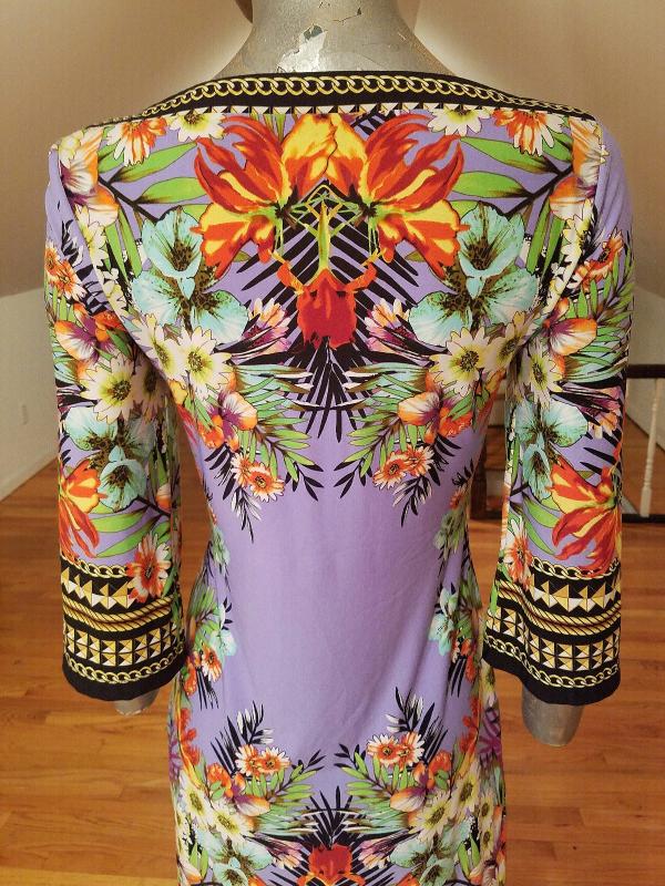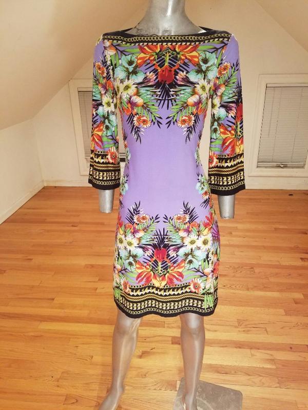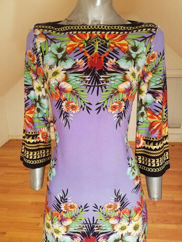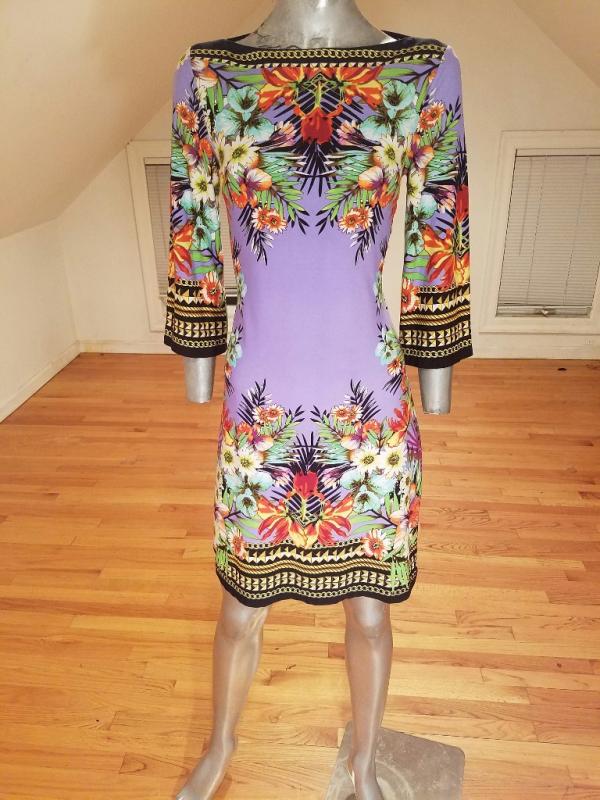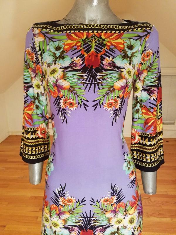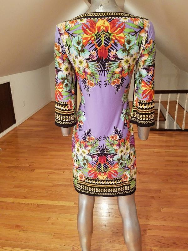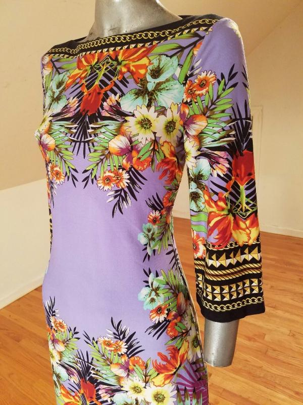 This dress is stunning. Vibrant colors and hand printed design spandex jersey content, very fluid and soft.