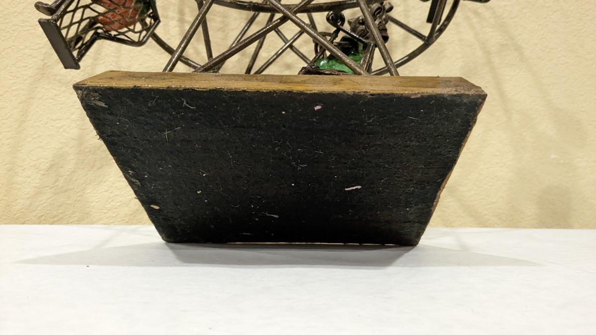 an amazing mid century folk/found art piece in excellent condition. Stunning detail to each person in their basket, each with movement atop lacquered wood base, note very minor separation on one corner. Approx. 15" wide x 20" tall. Unsigned.