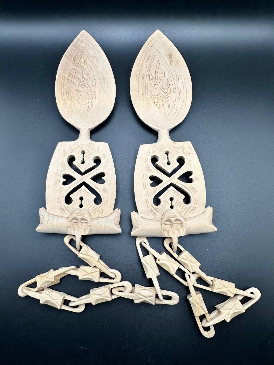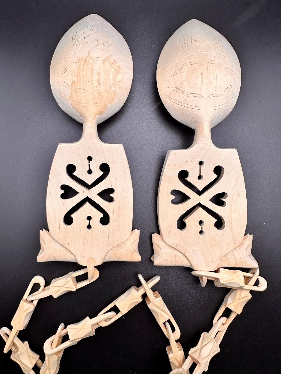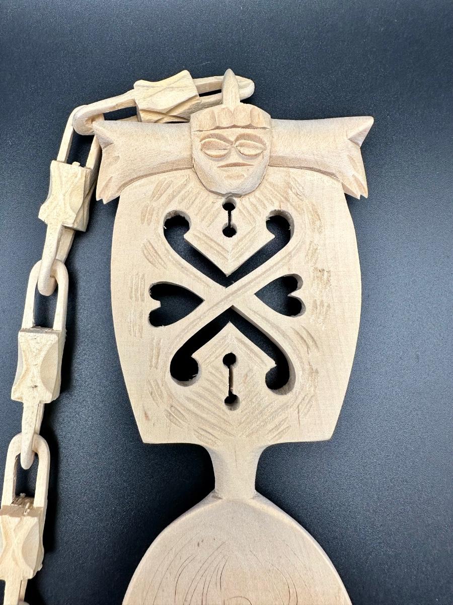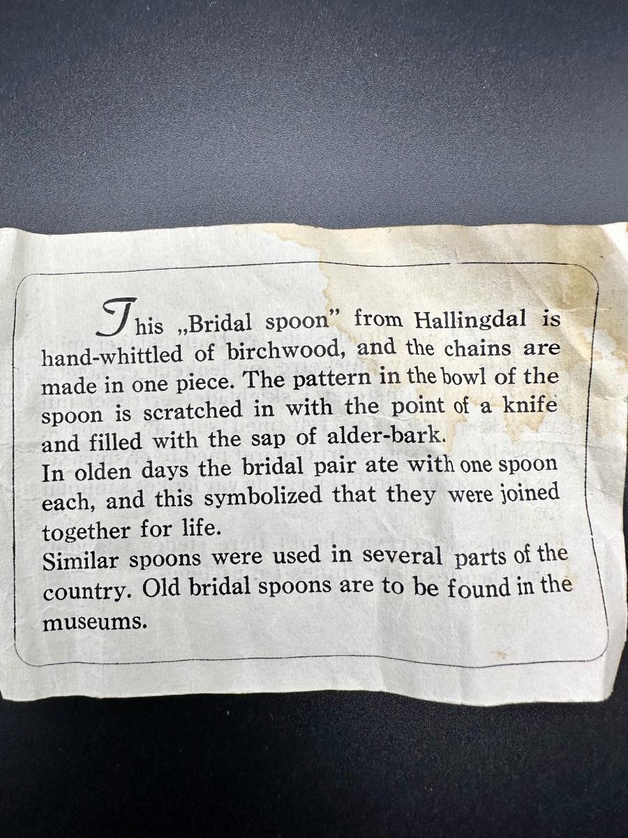 Painstakingly hand carved from a single piece of birch wood (no joints or breaks in any links) symbolizing the unbreakable bond of marriage. Ceremonial Scandinavian wedding spoons were made by the groom as a gift to his bride as far back as the 1600’s. It is rumored after they shared their wedding meals, they hung it in their home for good luck. Been in original box since the wedding in the late 1960's.