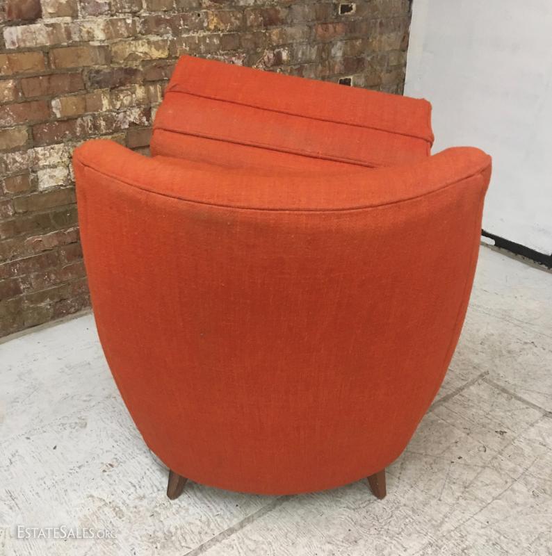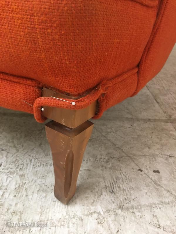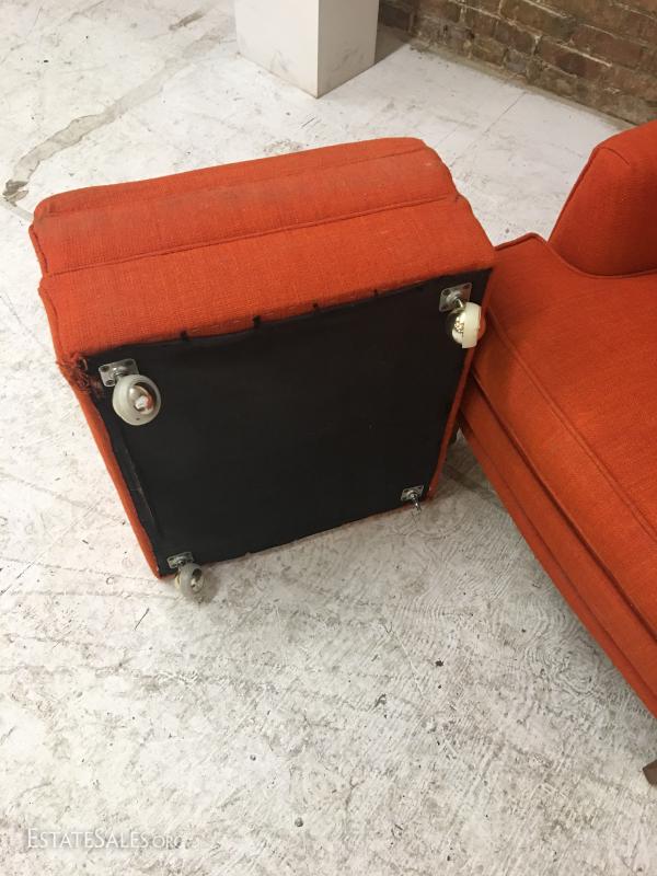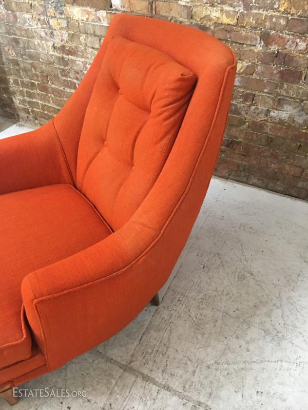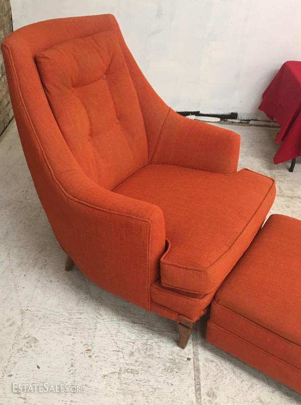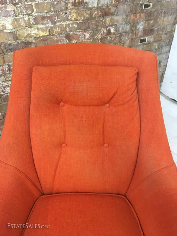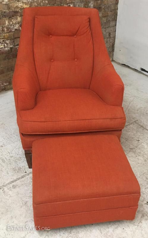 Chair is in good overall condition for its age. Ottoman has some wear to one edge and is missing one of it's wheels although it may turn up in the warehouse somewhere.