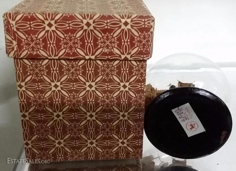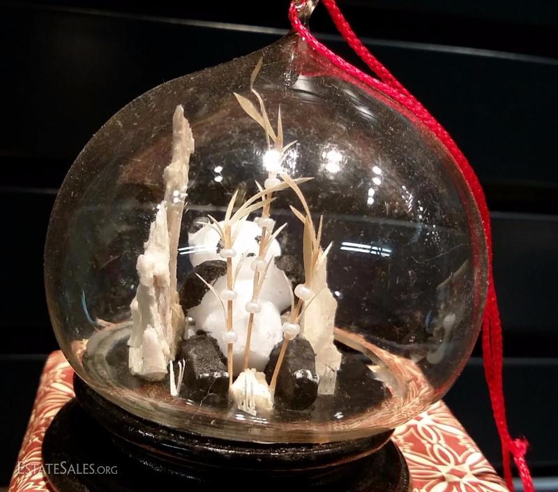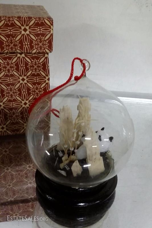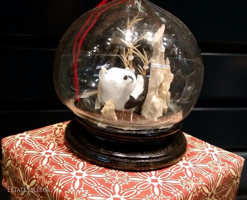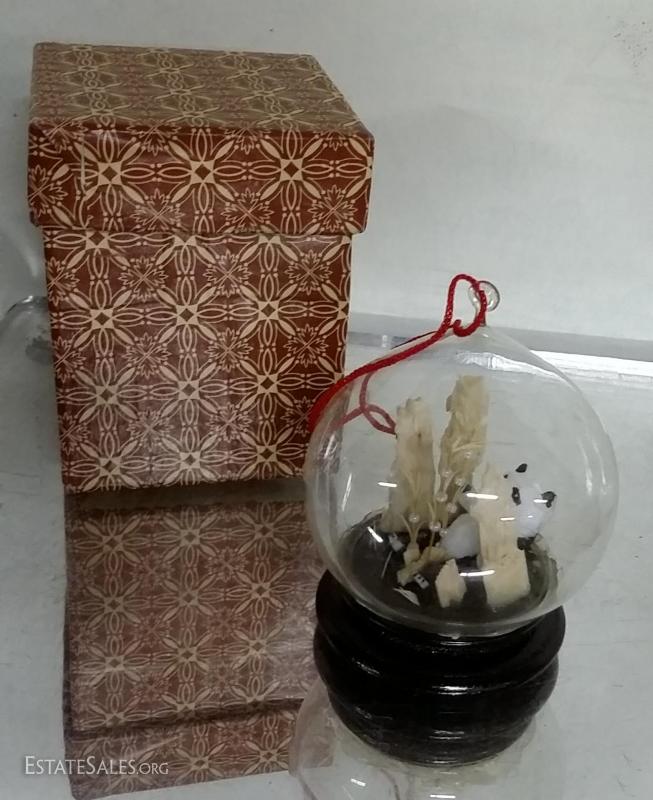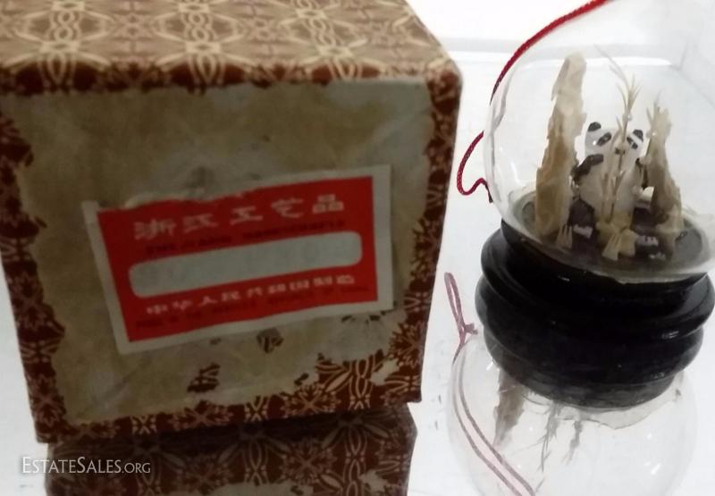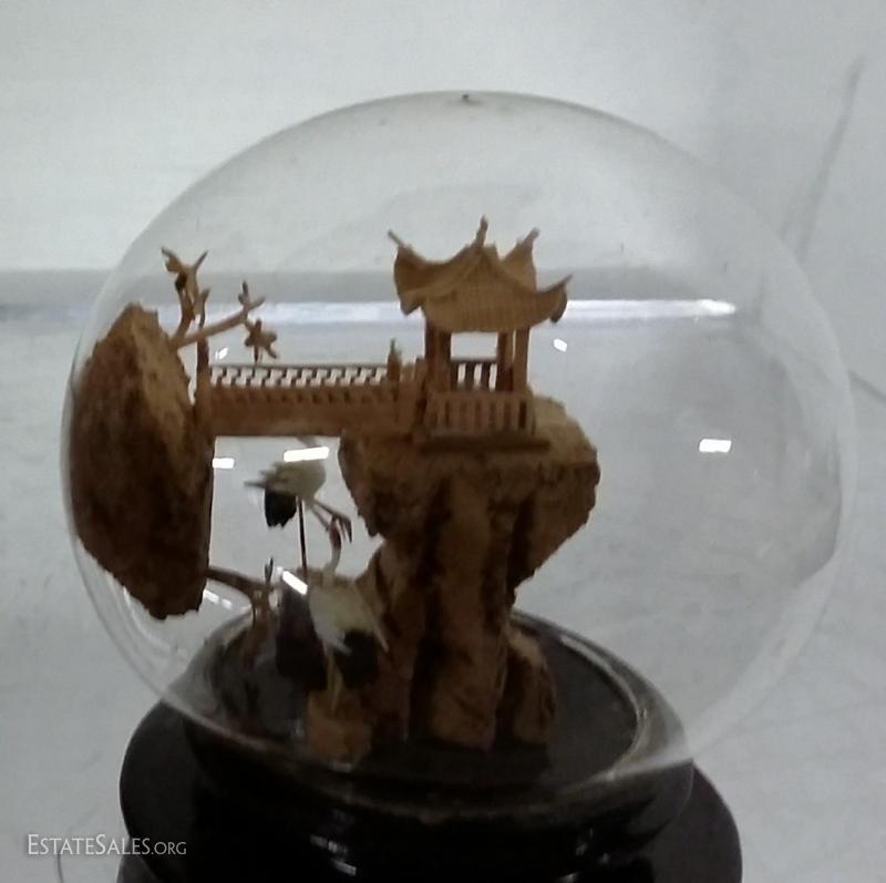 1960s Oriental Chinese Hand Carved Cork Diorama In Glass Globe comes in the original box. This intricately carved scene is made one at a time and no two are alike. Made In China.