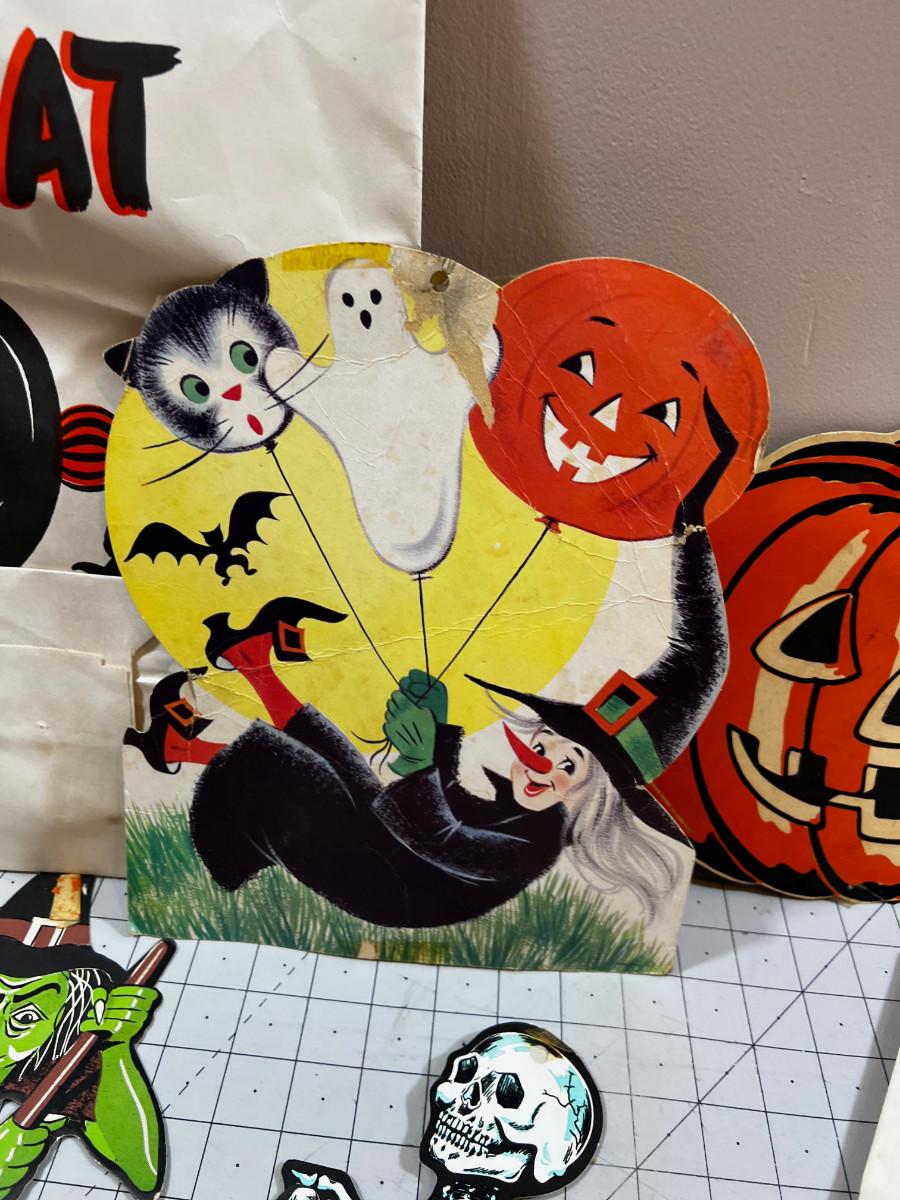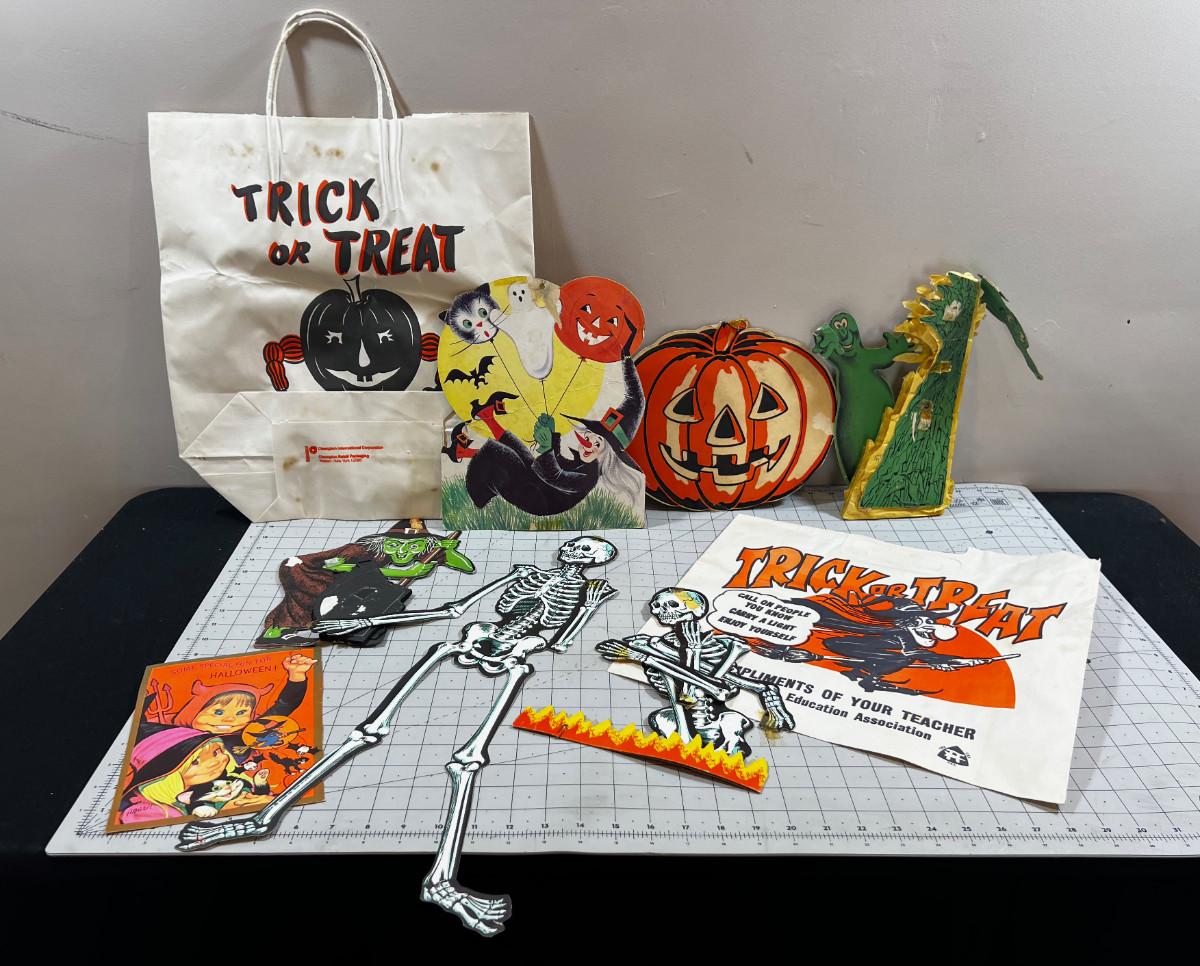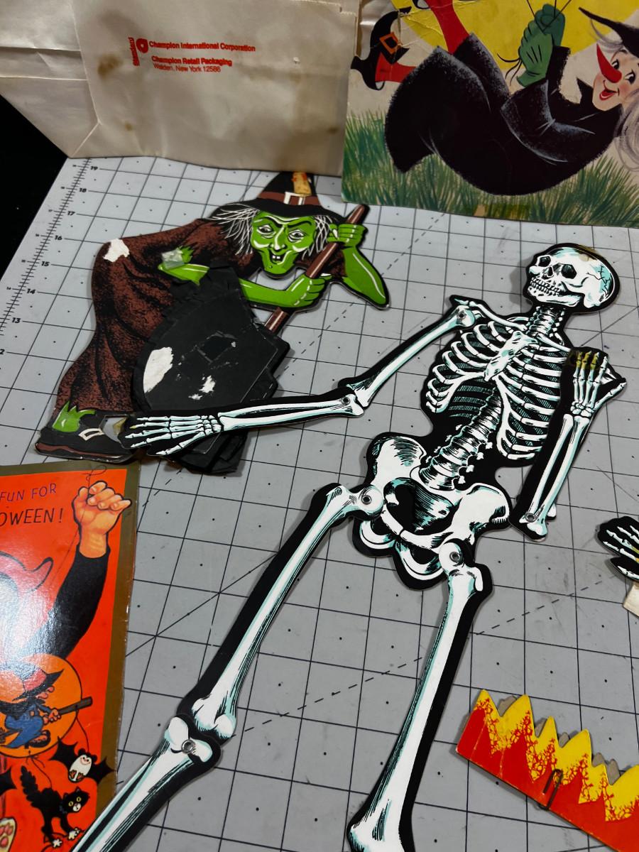 1960's Paper Halloween Cardboard Decorations: 2 Skeletons, Accordion Tissue Witch, Paper Bag, Balloons & Witch.