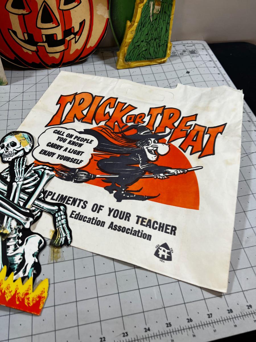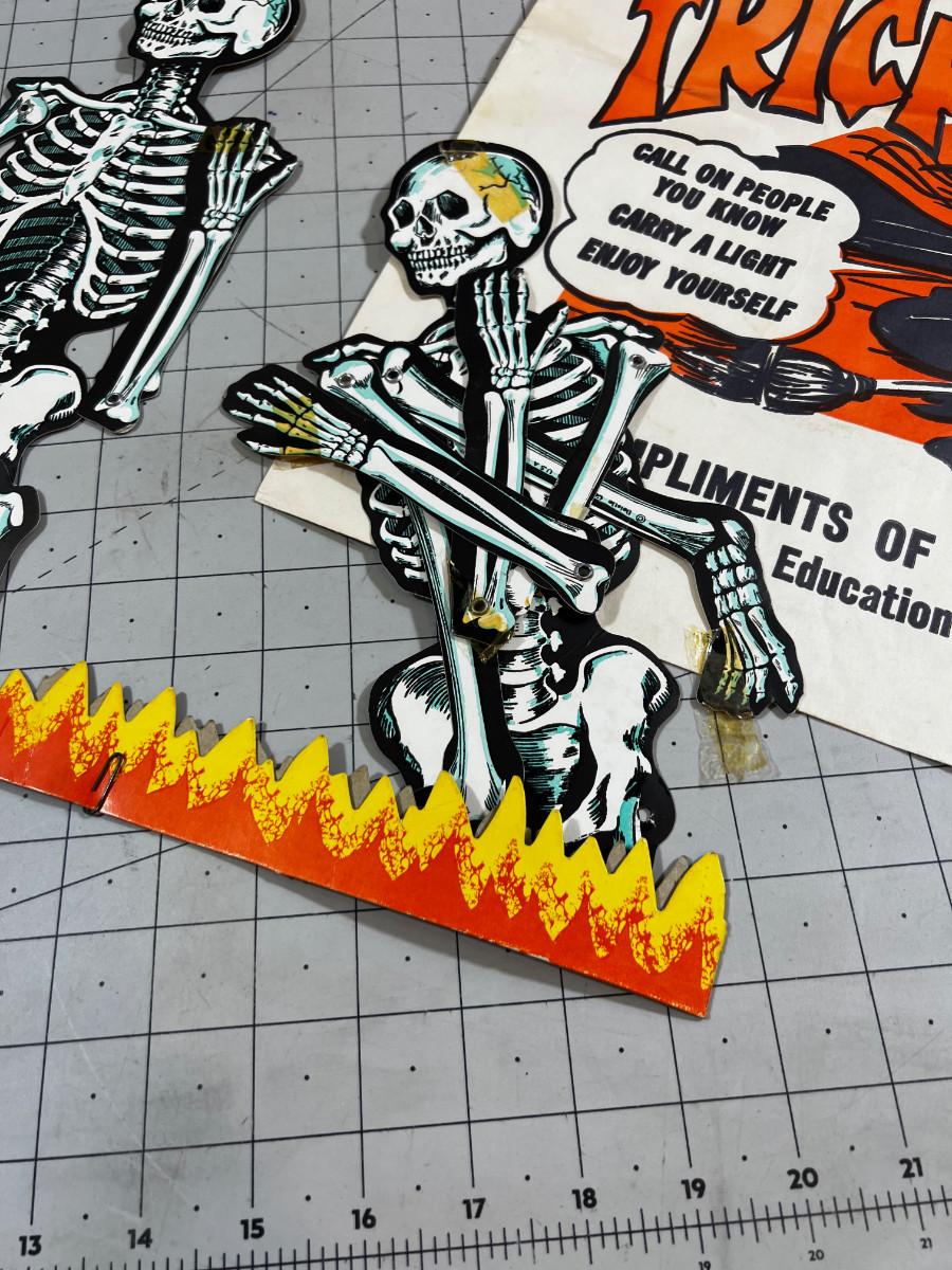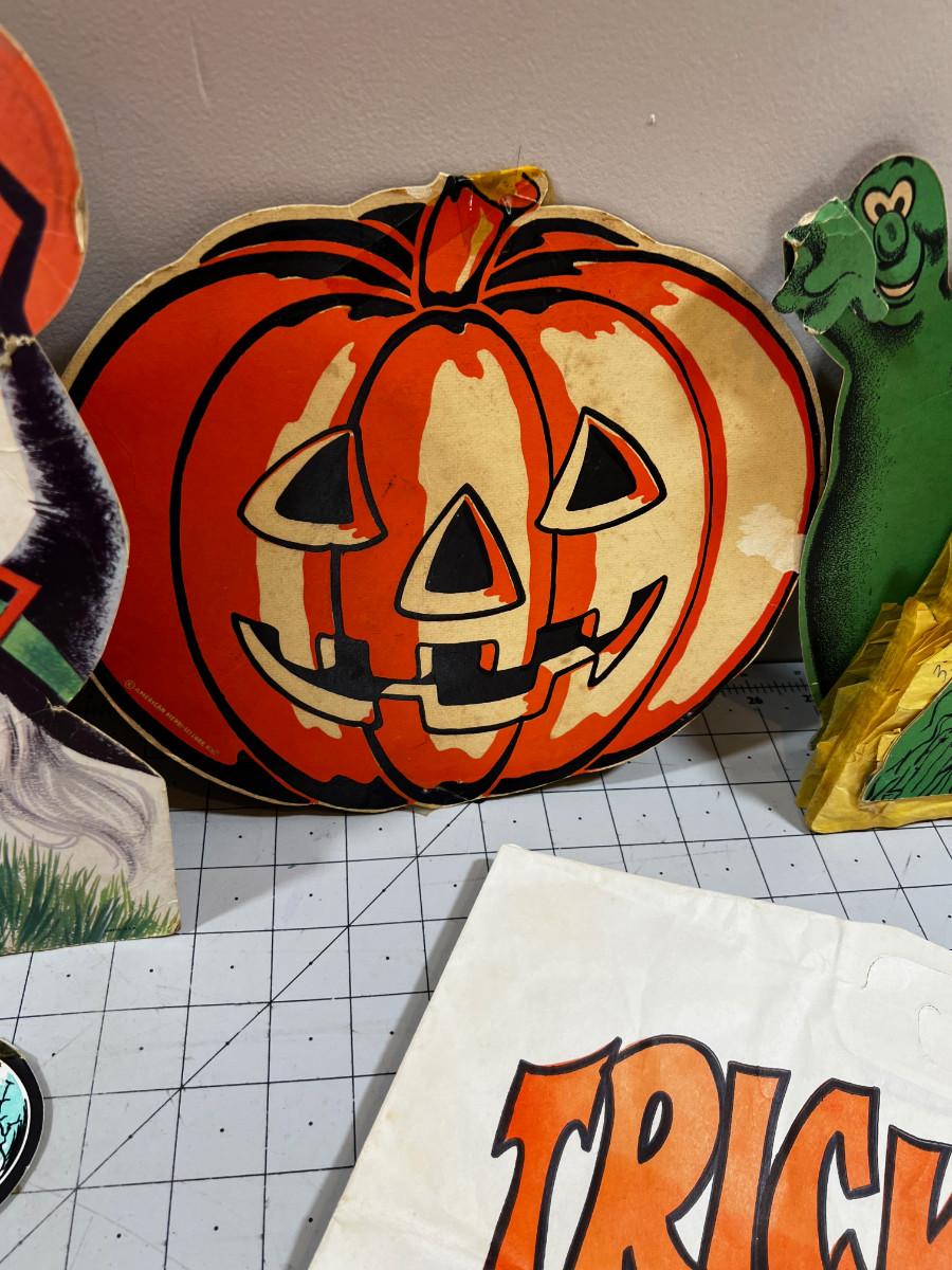 1960's Paper Halloween Cardboard Decorations: 2 Skeletons, Accordion Tissue Witch, Paper Bag, Balloons & Witch.