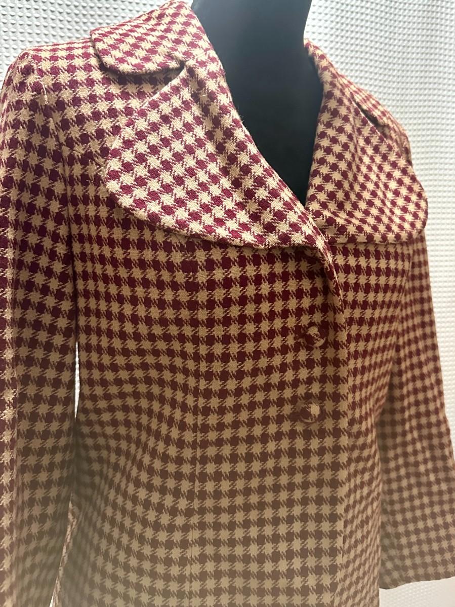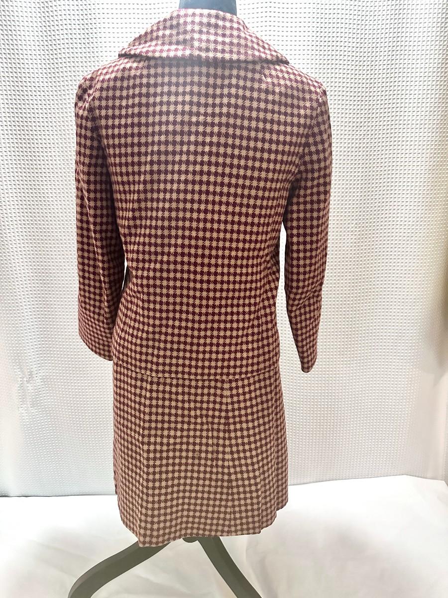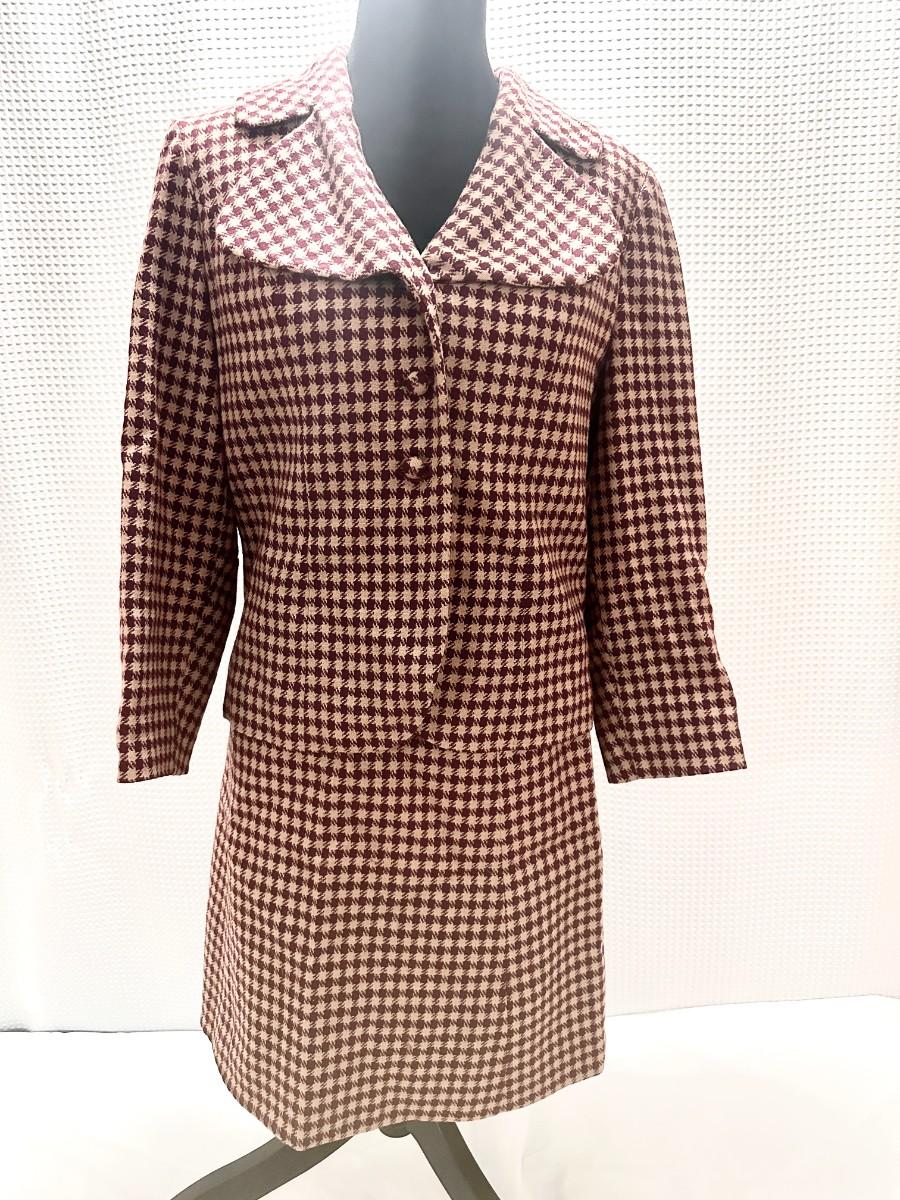 Maroon and beige fitted suit. Size says 11/12 but closer to a 9/10 in today's sizes. Great condition. No stains or tears. All buttons in place.