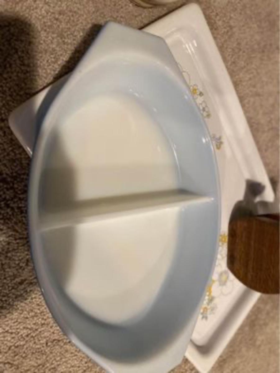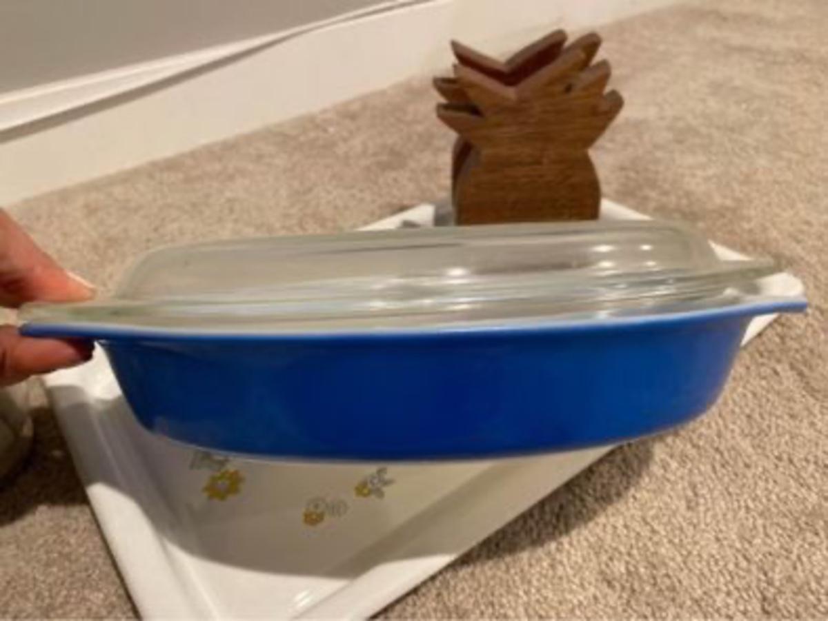 Vintage 1960s cobalt blue divided dish with lid. No damage. In excellent condition. 1 1/2 quart.