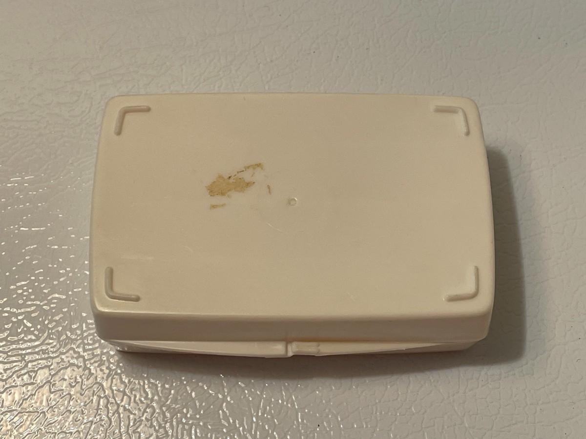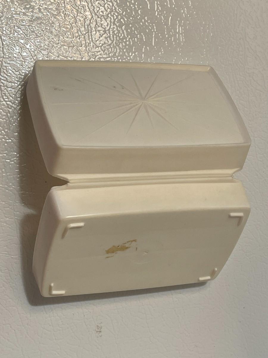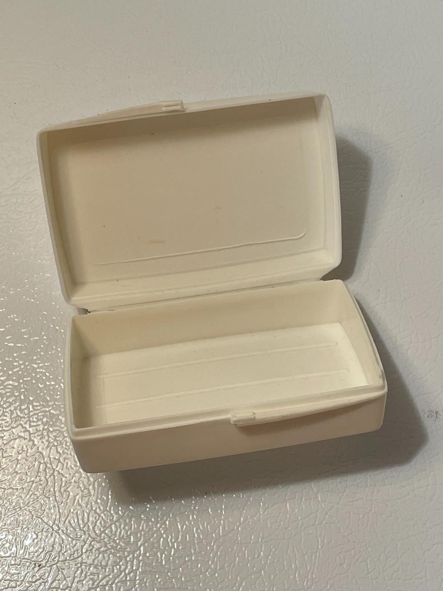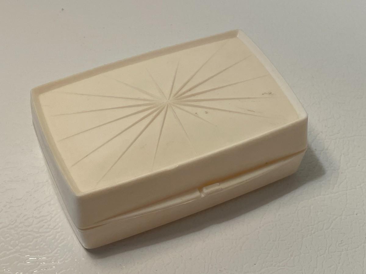 This plastic travel box for a bar of soap was made by Lustro Ware in the 9160s. It has a starbust on the lid and is in excellent condition.