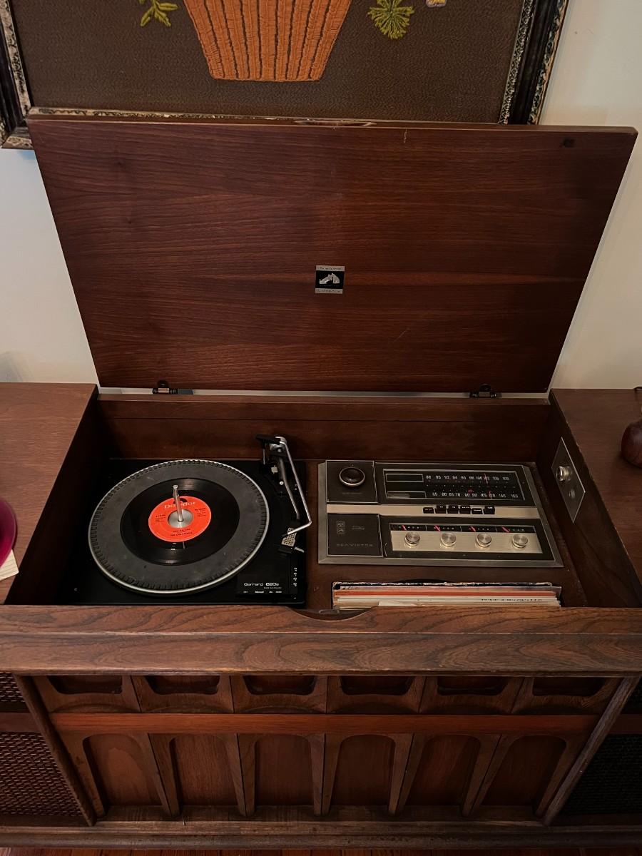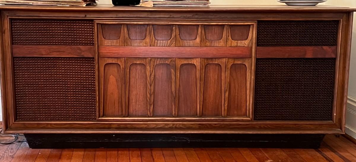 Measures 54.5" long x 20" deep x 26.5" high. Walnut finish. *Contents shown on Victrola are NOT included* Please see all pictures as they are the best representation of the items. The pictures show condition and what is included in the lot. All items unless noted, are pre-owned and have been used. *If you purchase furniture, you MUST bring help. We do not allow one person to carry large furniture out on their own. Bring help, tools and a truck for the safety of our client's home, and our buyers, to include yourself. Any damages that result to the property including walls and floors due to moving of the furniture will be charged to the buyer.*