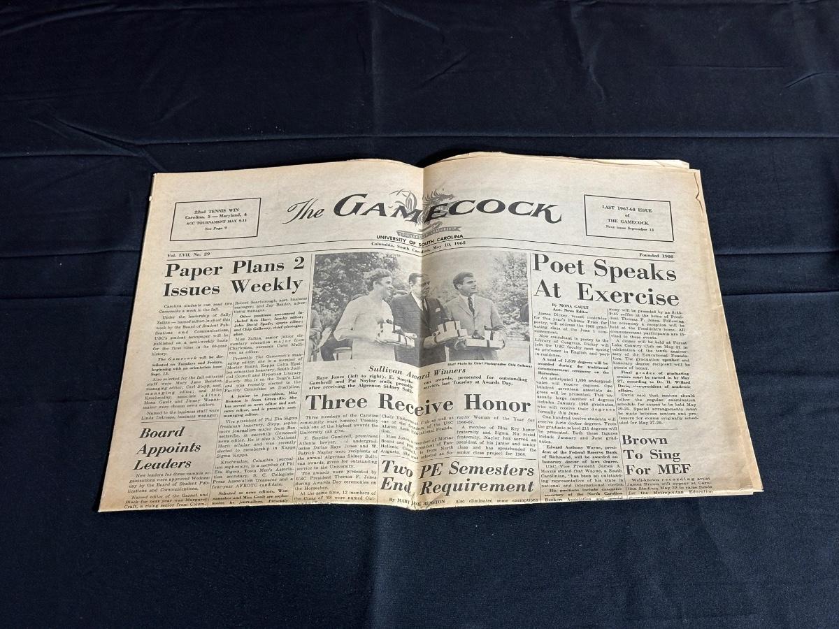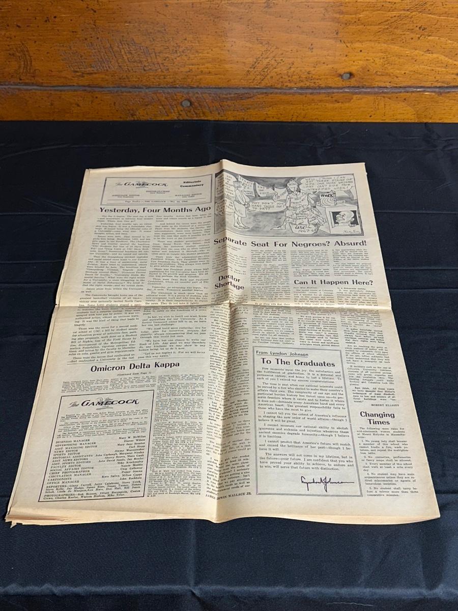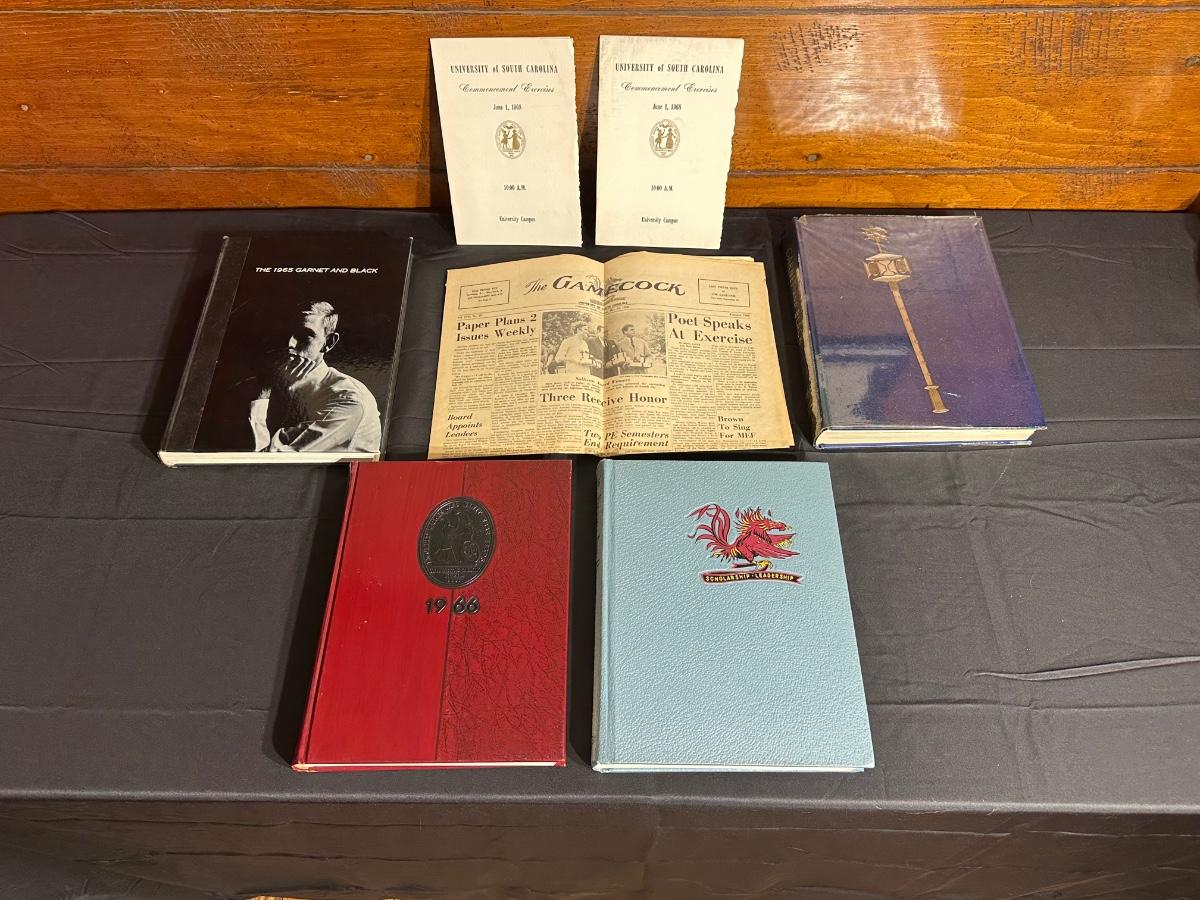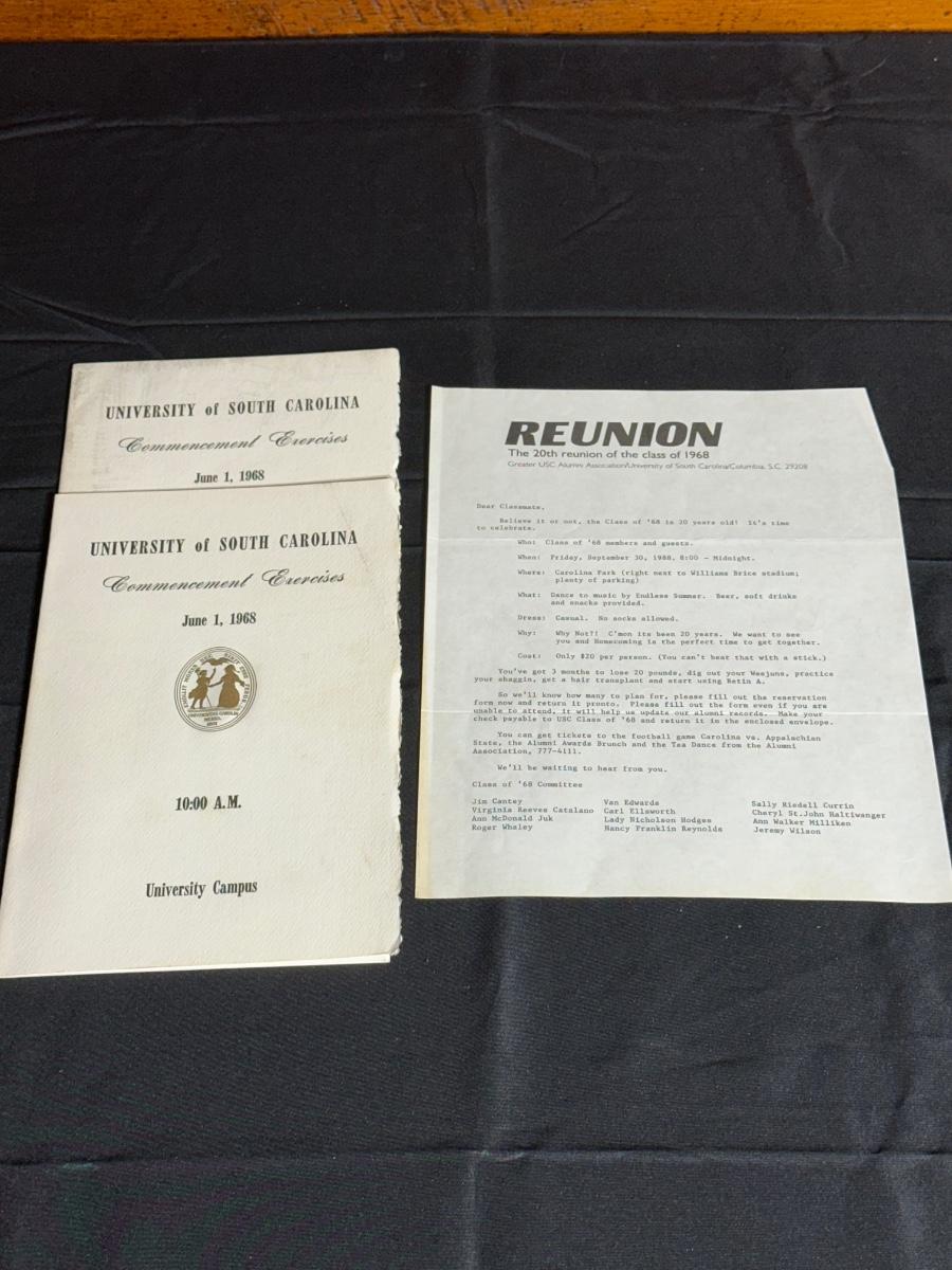 Includes 1965, 66, 67 and 68 Issues of Garnet & Black for the University of South Carolina, “The Gamecock” Newspaper Issue from 1968, two commencement programs and a print out for the reunion for the class of 1968.