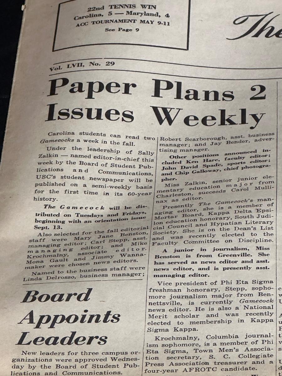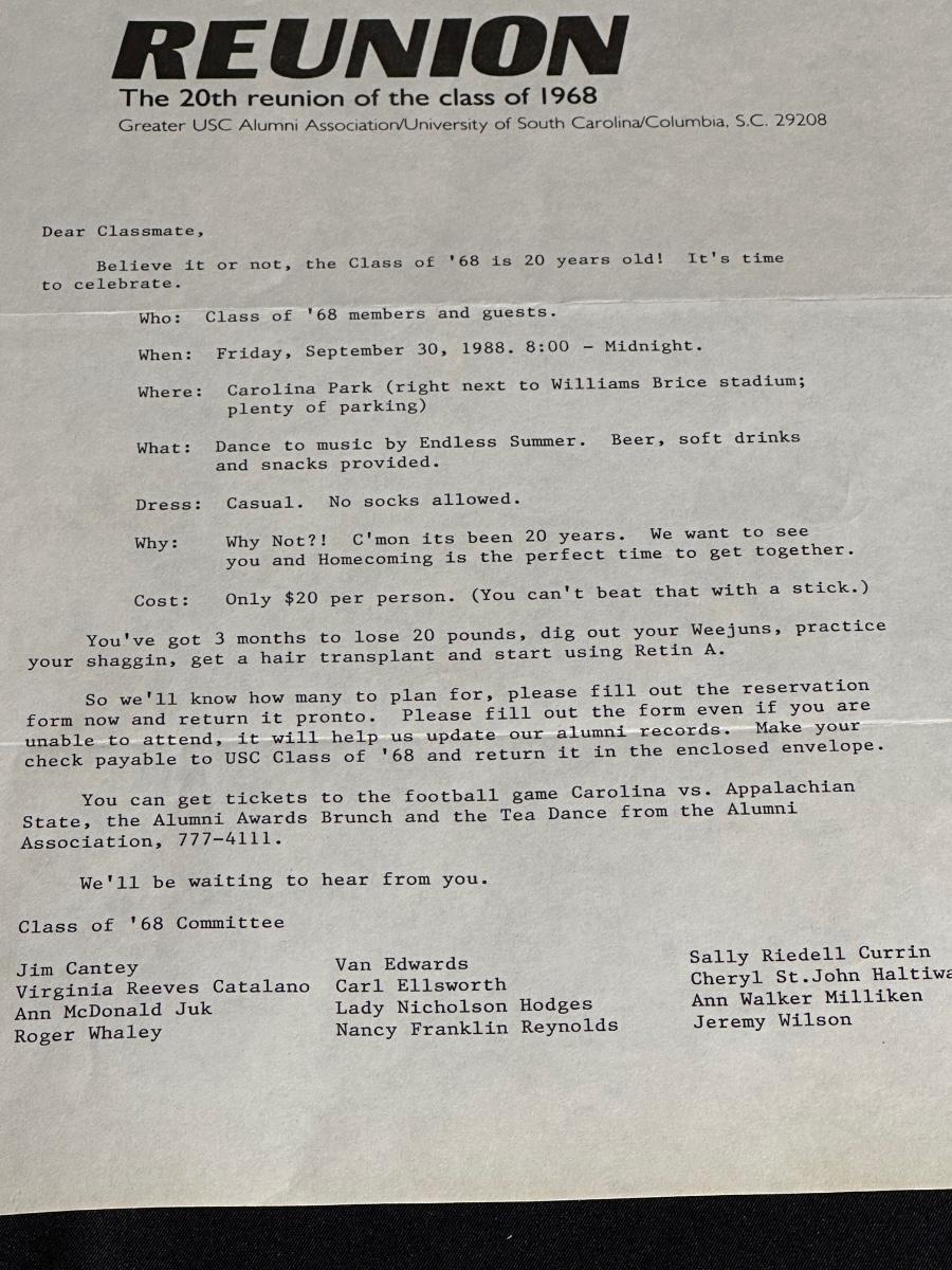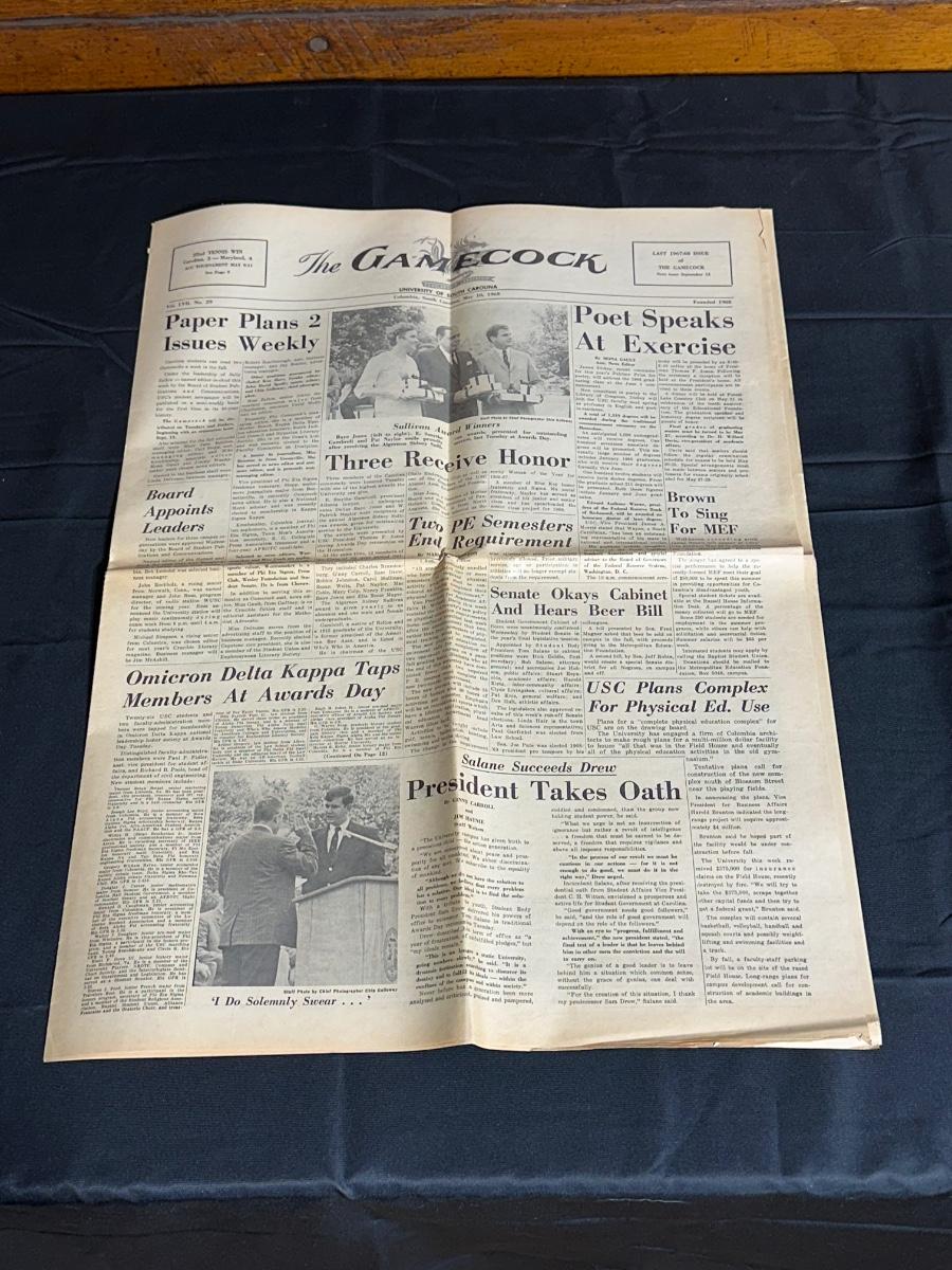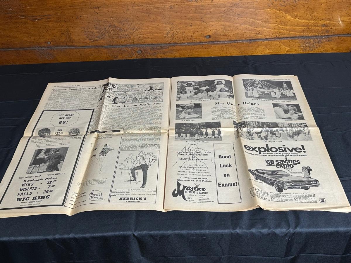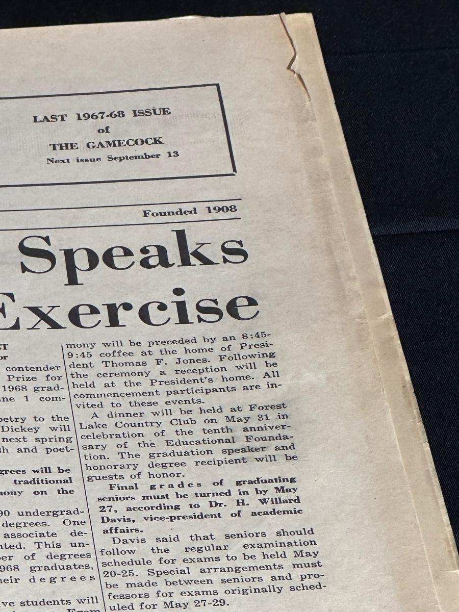 Includes 1965, 66, 67 and 68 Issues of Garnet & Black for the University of South Carolina, “The Gamecock” Newspaper Issue from 1968, two commencement programs and a print out for the reunion for the class of 1968.