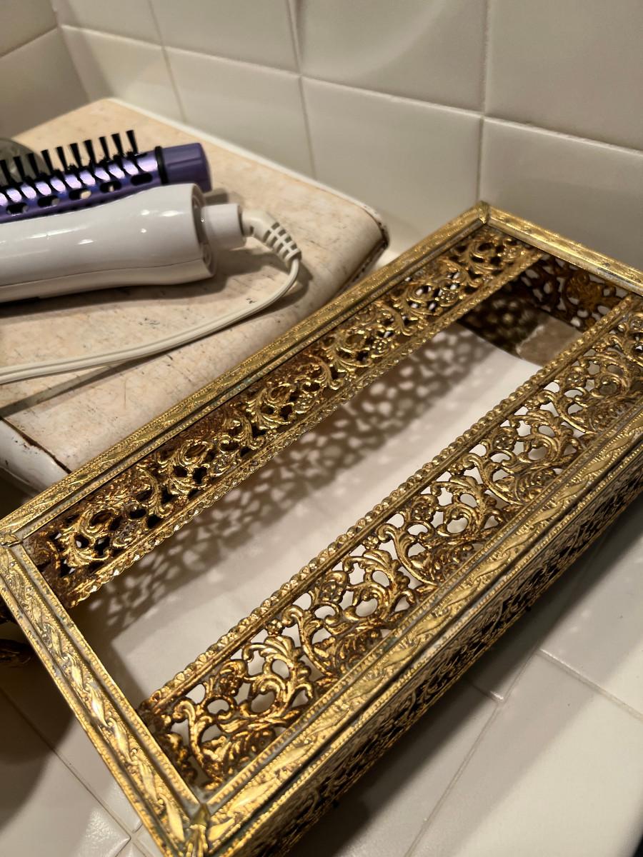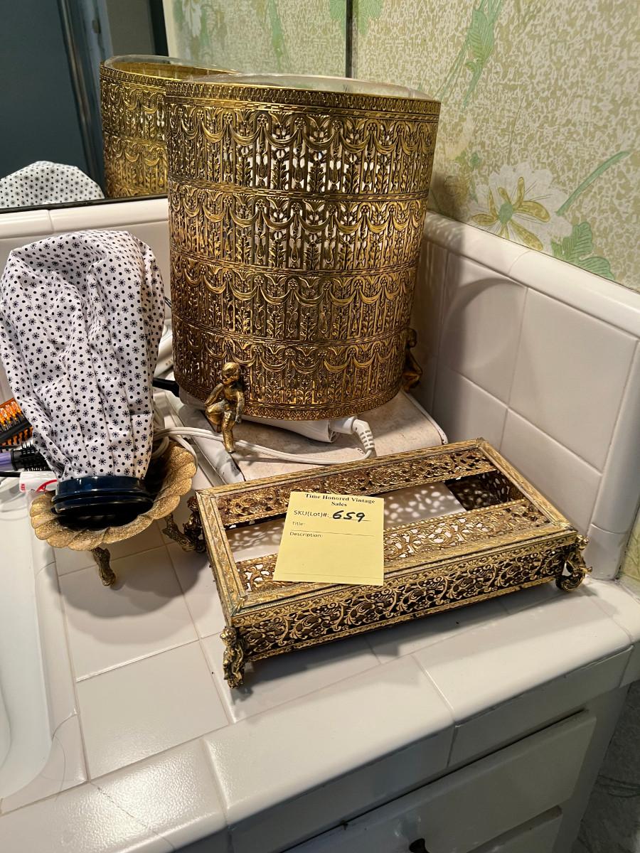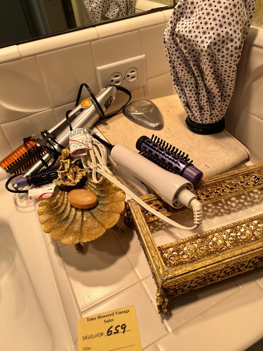 Classic ice bag, tissue and matching gold color trash can, shell soap holder, curling iron, straightener. Scale ( untested)