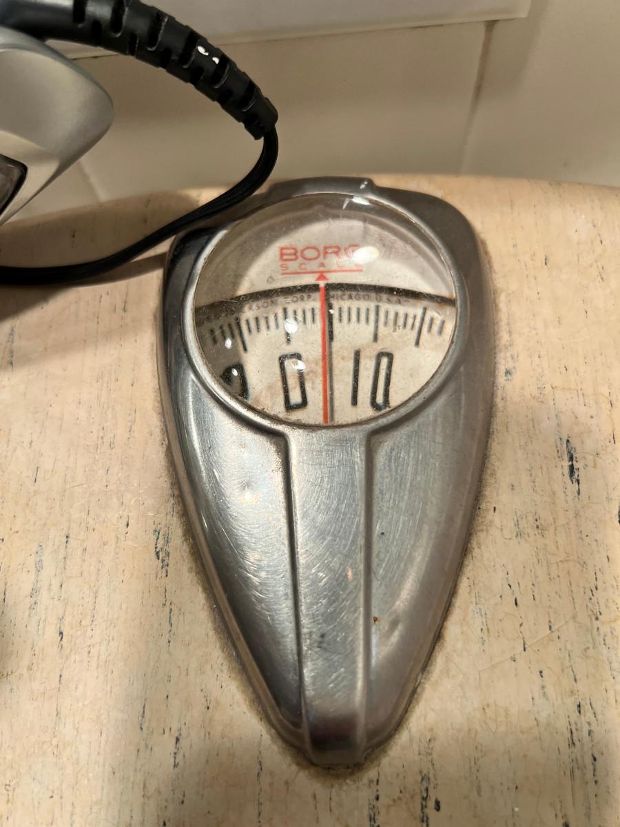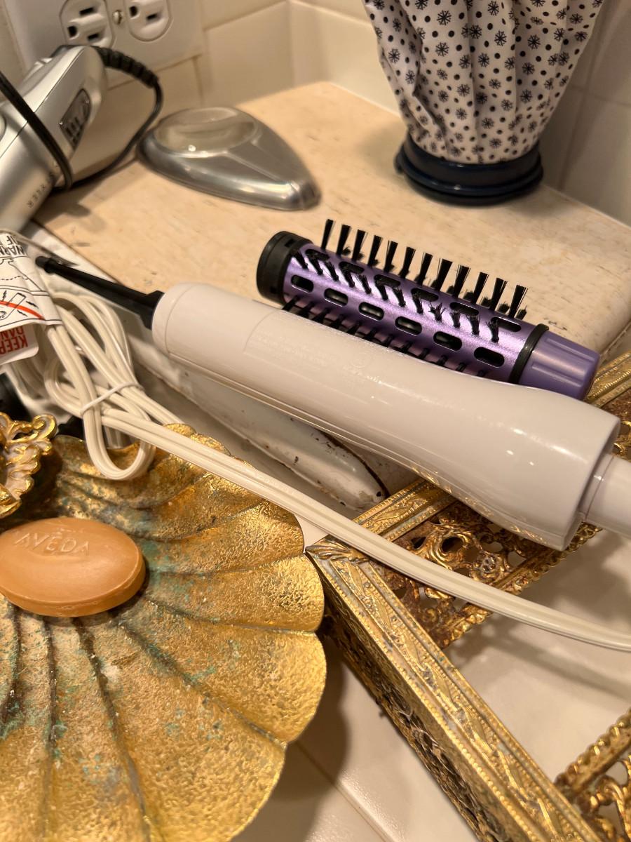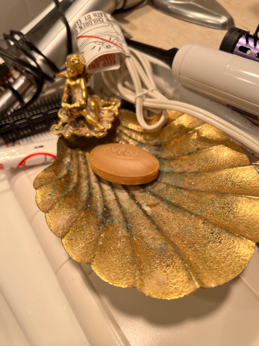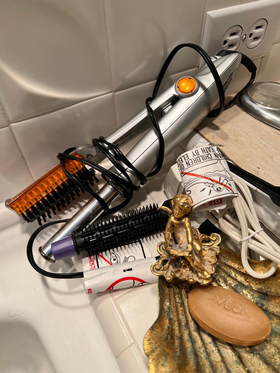 Classic ice bag, tissue and matching gold color trash can, shell soap holder, curling iron, straightener. Scale ( untested)