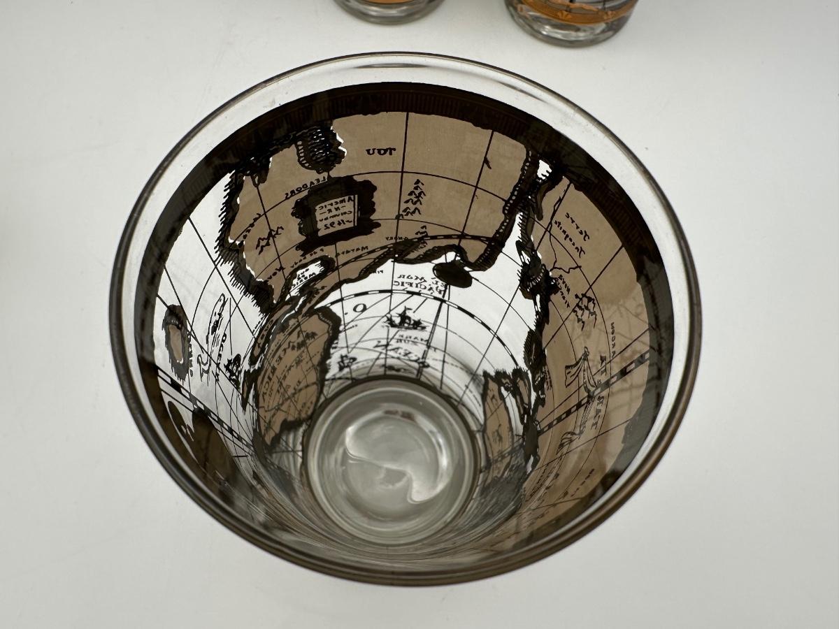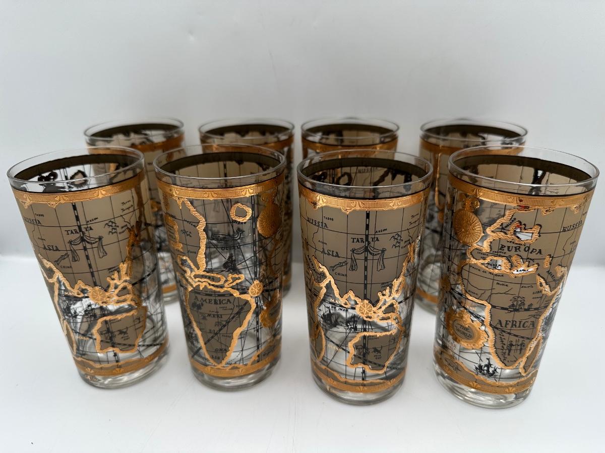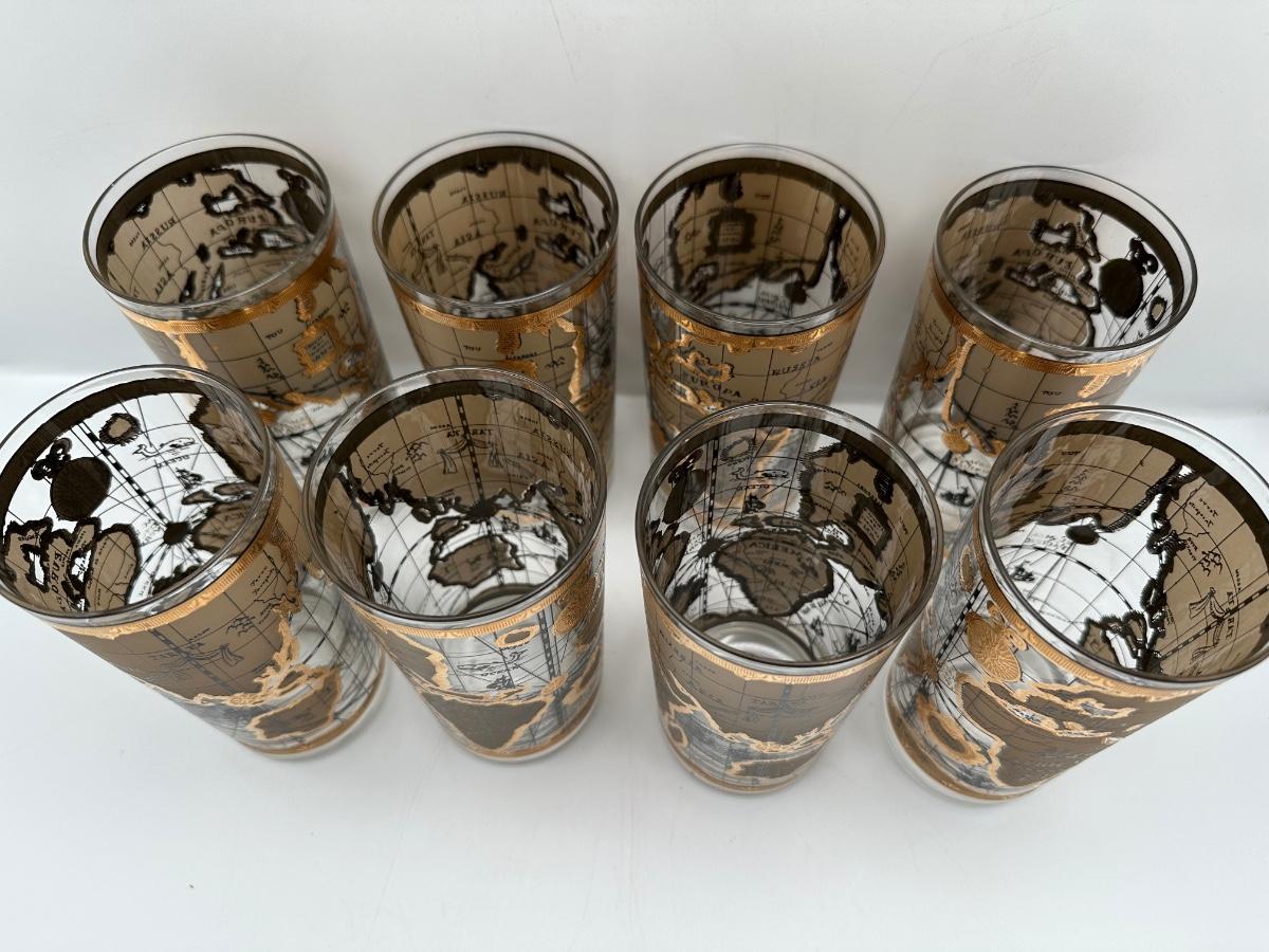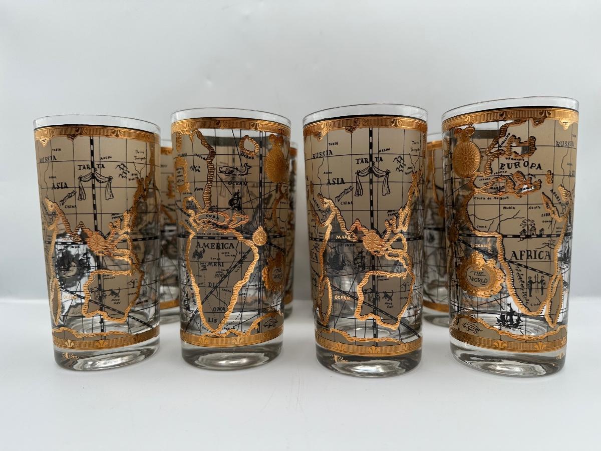 Set of 8 1960s Vintage Cera “World Map” Old Fashioned Barware 22k Gold Decoration.
