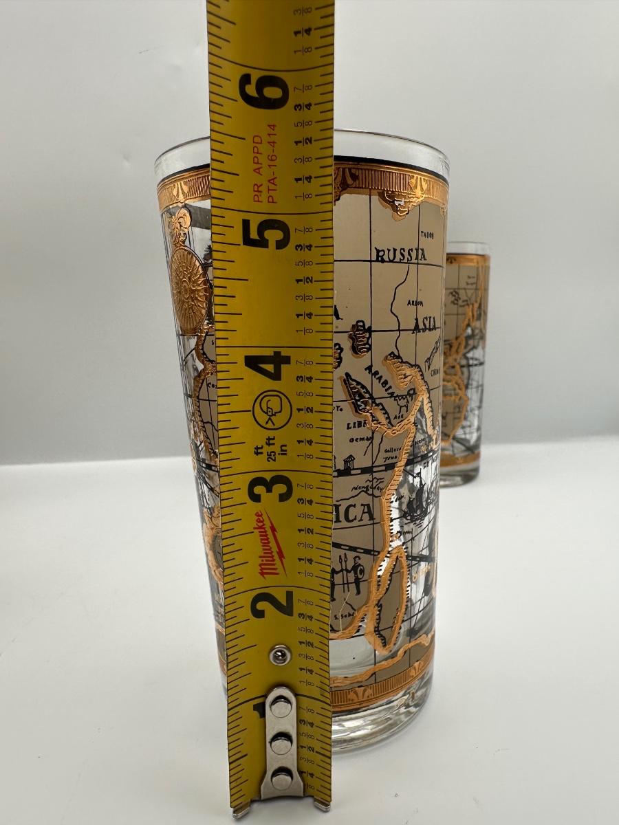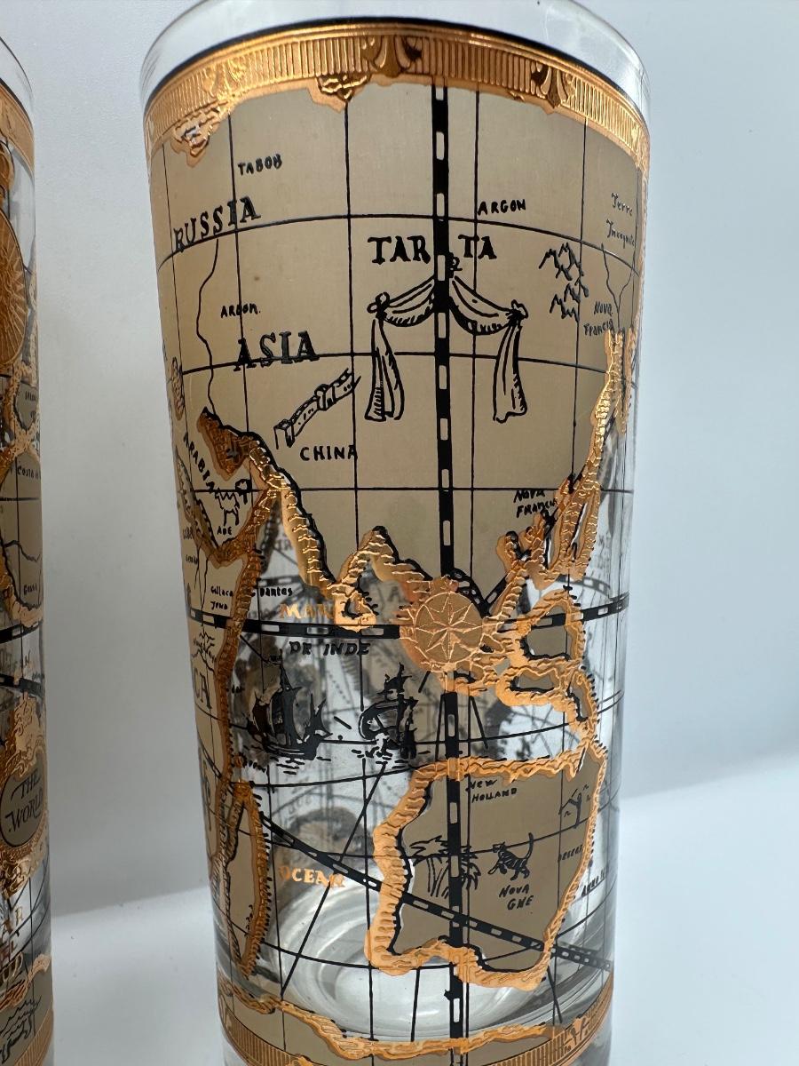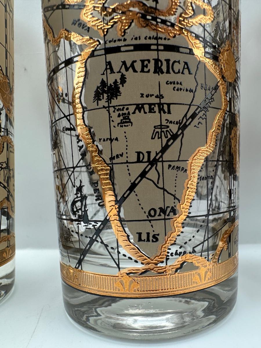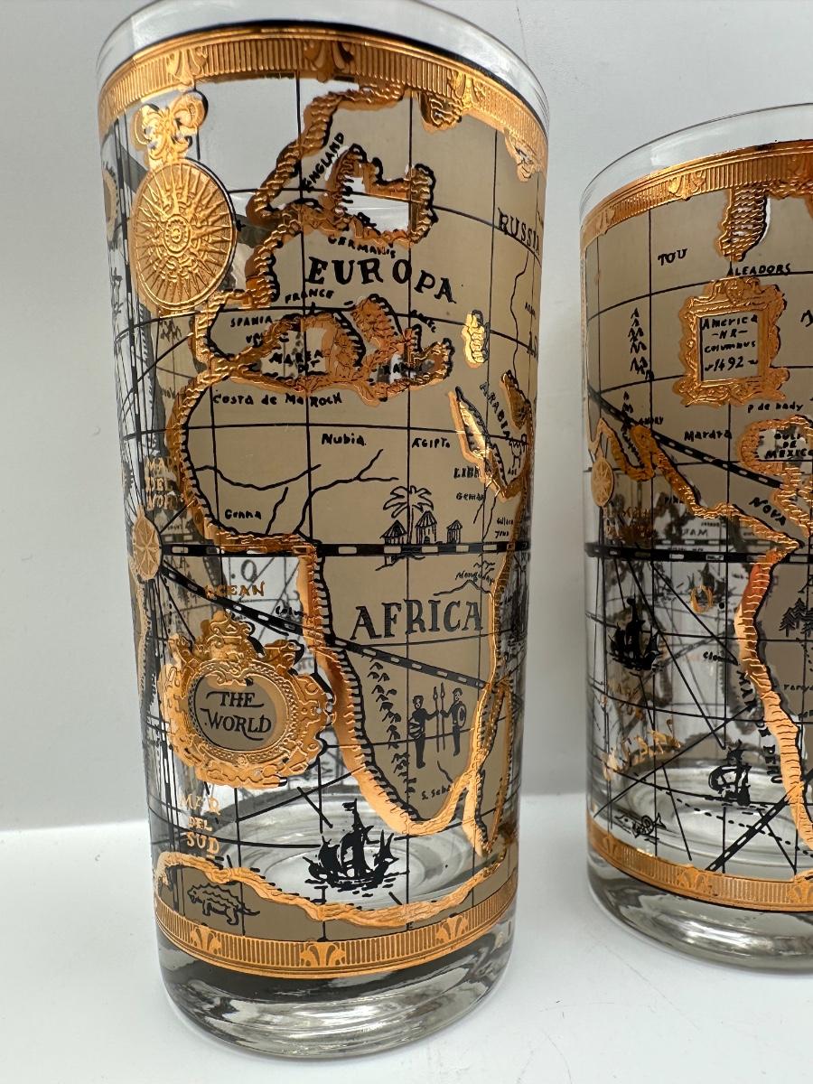 Set of 8 1960s Vintage Cera “World Map” Old Fashioned Barware 22k Gold Decoration.