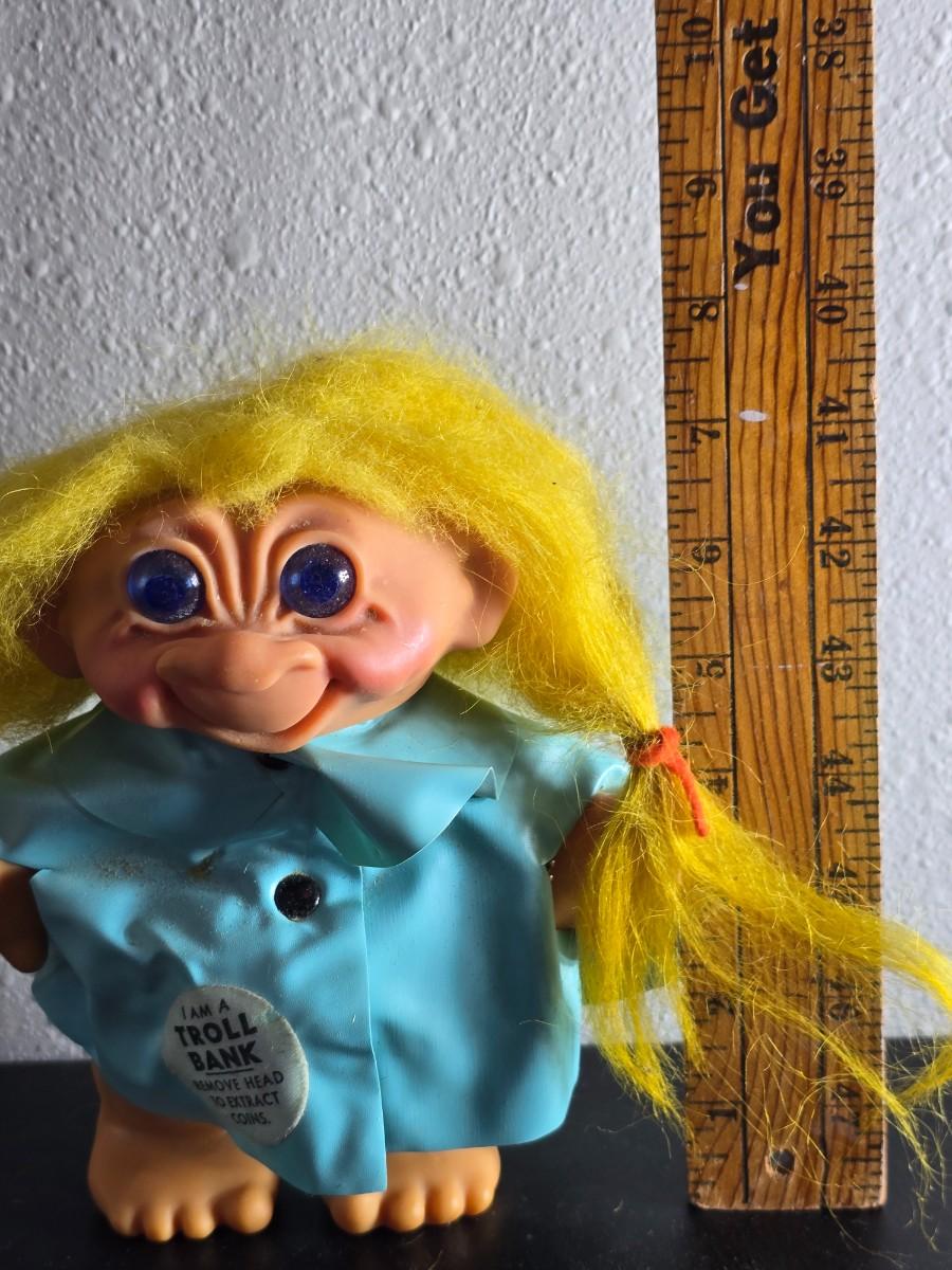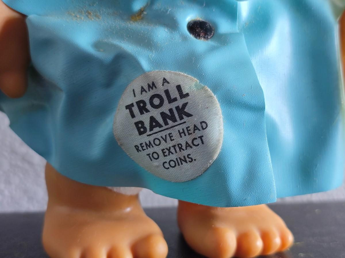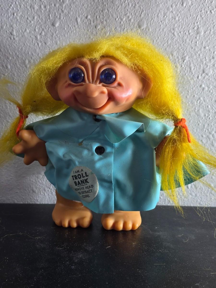 1960'S Vintage girl Troll bank with blue vinyl raincoat - Rare Thomas Dam 7" Troll doll
