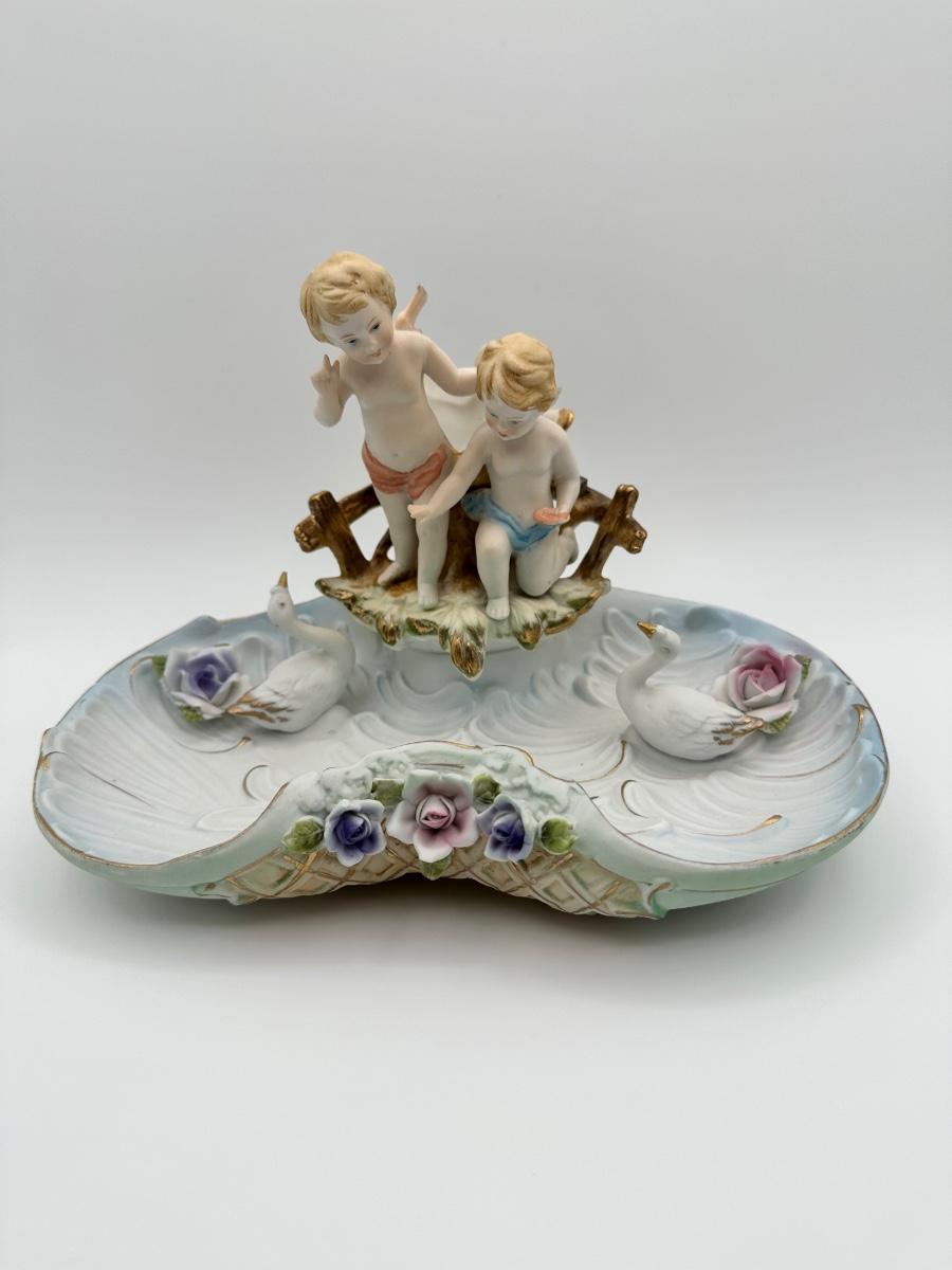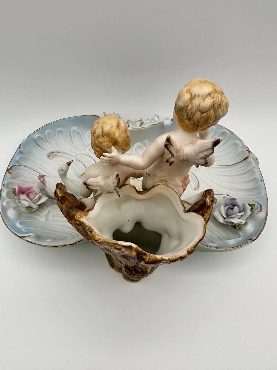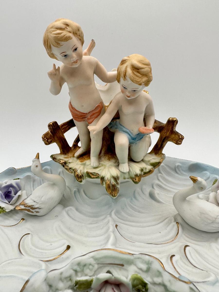 Hand painted vintage, delicate, porcelain bisque centerpiece with bud vase at rear. Marked House of David, from Norleans Japan. Purchased in the early 60’s. Sweet and precocious little angel cherubs perched on a bank in front of a tree stump feeding white swans. Adorned with raised roses and tree stump is bud vase. Original condition. Read more about the House of David Colony and their artwork at https://hodmuseum.tripod.com/museum.html.