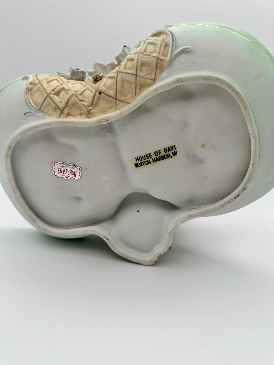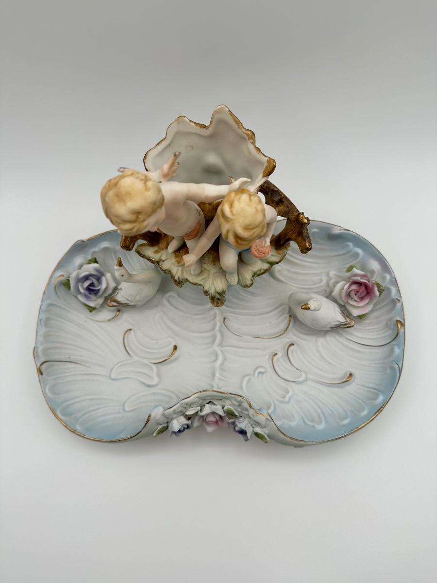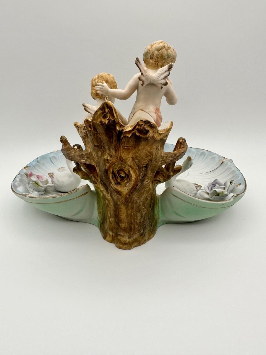 Hand painted vintage, delicate, porcelain bisque centerpiece with bud vase at rear. Marked House of David, from Norleans Japan. Purchased in the early 60’s. Sweet and precocious little angel cherubs perched on a bank in front of a tree stump feeding white swans. Adorned with raised roses and tree stump is bud vase. Original condition. Read more about the House of David Colony and their artwork at https://hodmuseum.tripod.com/museum.html.