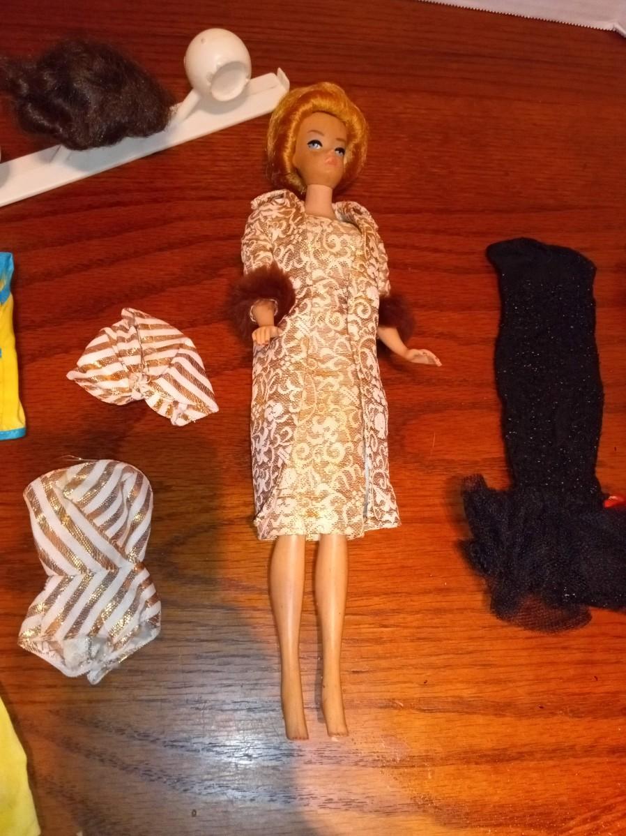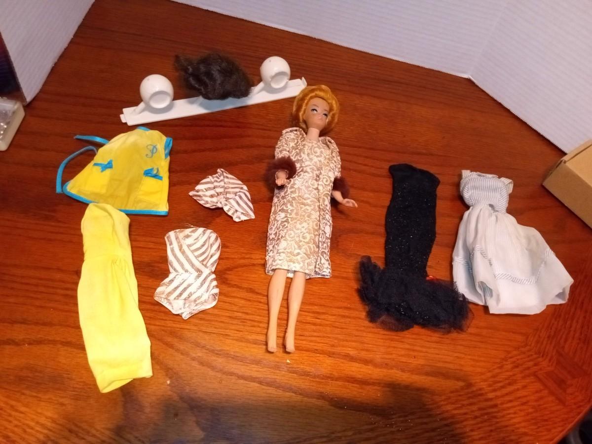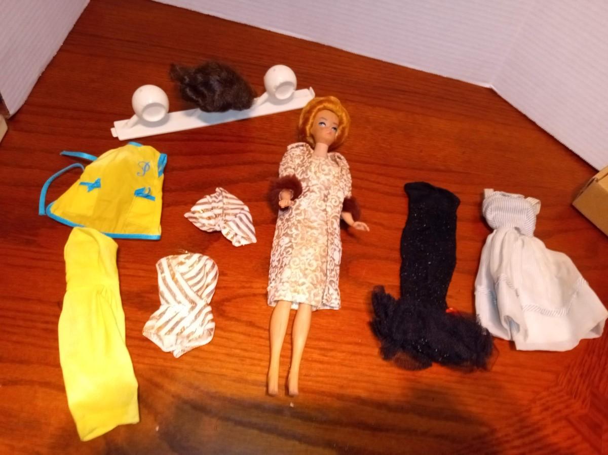 DOLL AND CLOTHES IN GOOD SHAPE, THE BROWN WIG SEEMS TO BE GLUED TO THE HOLDER
