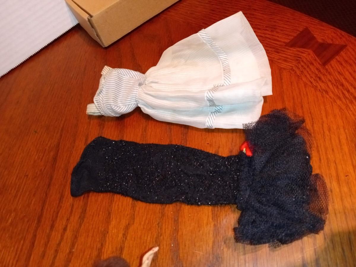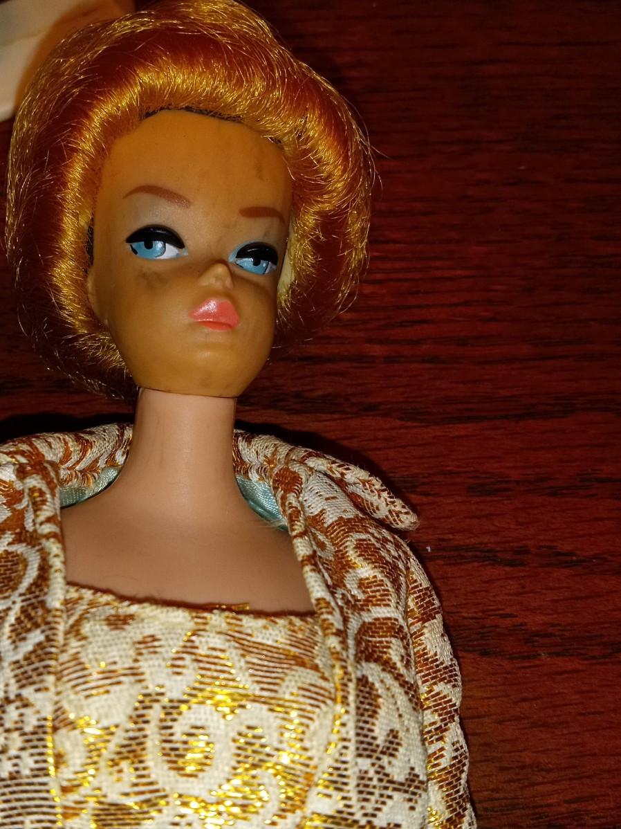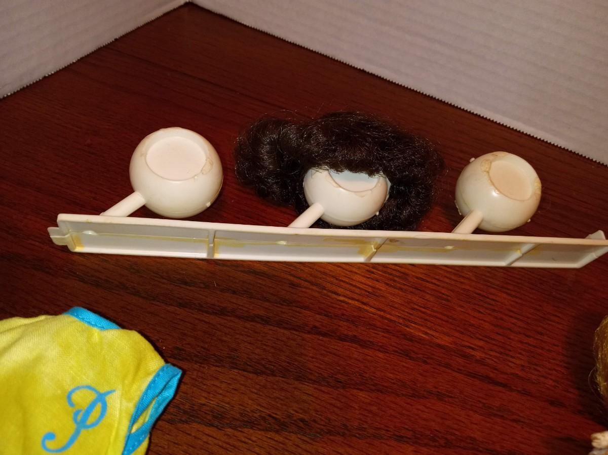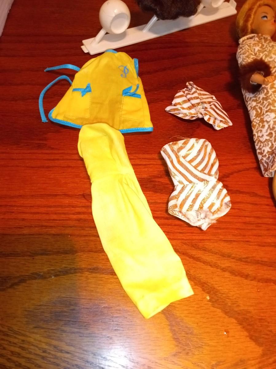 DOLL AND CLOTHES IN GOOD SHAPE, THE BROWN WIG SEEMS TO BE GLUED TO THE HOLDER