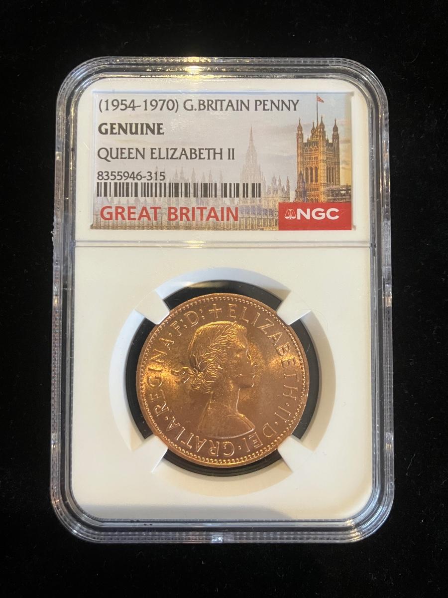 1962 UK QEII Penny – NGC Slabbed Genuine – Beautiful Large Bronze Coin!