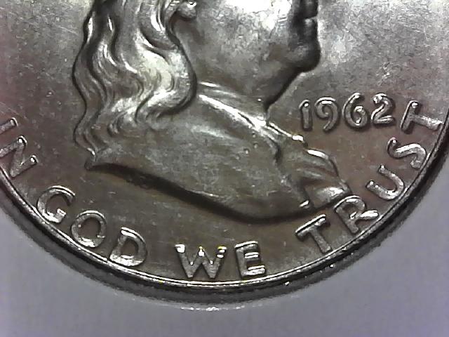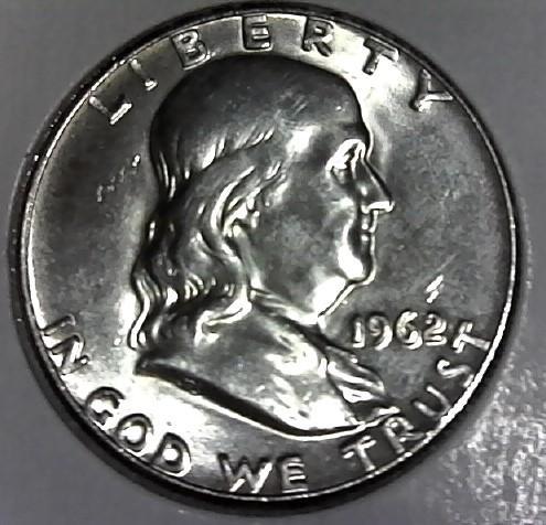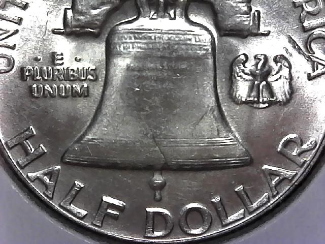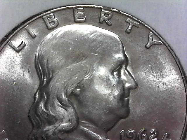 1962-D Franklin Silver Half Dollar Great Luster Possible AU obverse minor scratch above date but terrific cartwheel portrait has nice relief lines and crisp legend and motto lettering. Reverse equally crisp in relief and legend. Minimal wear at bell.