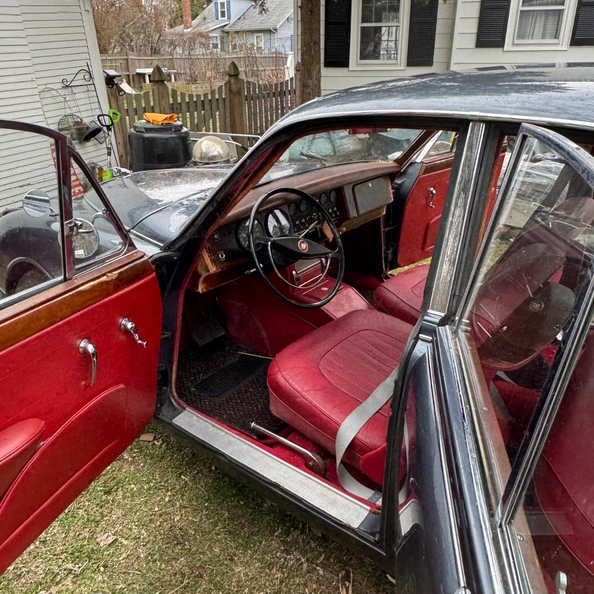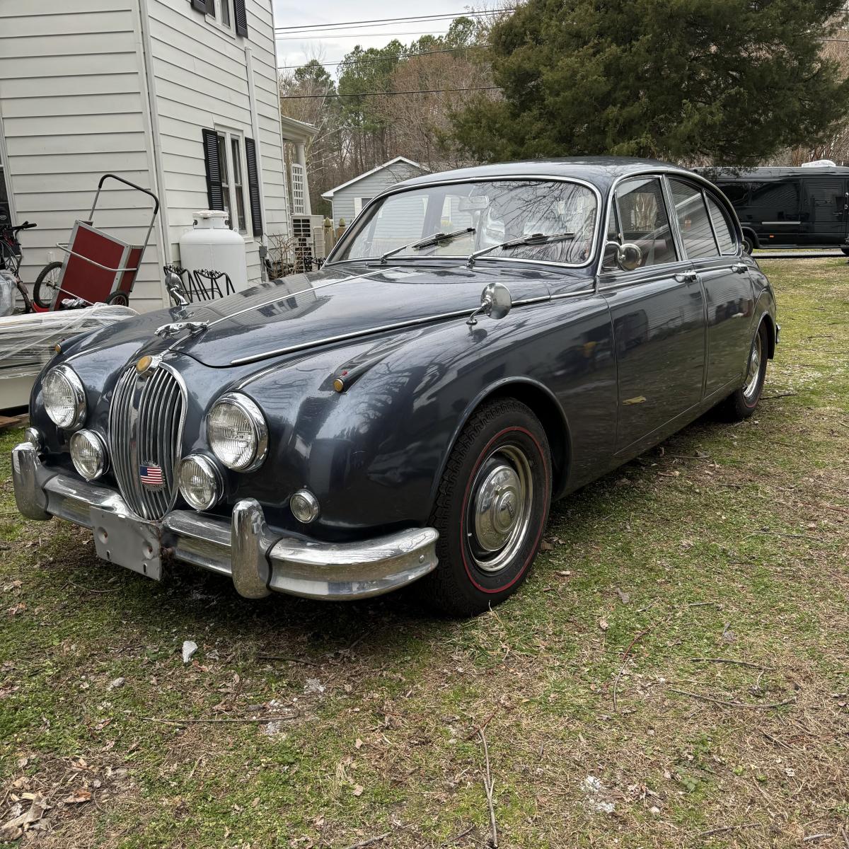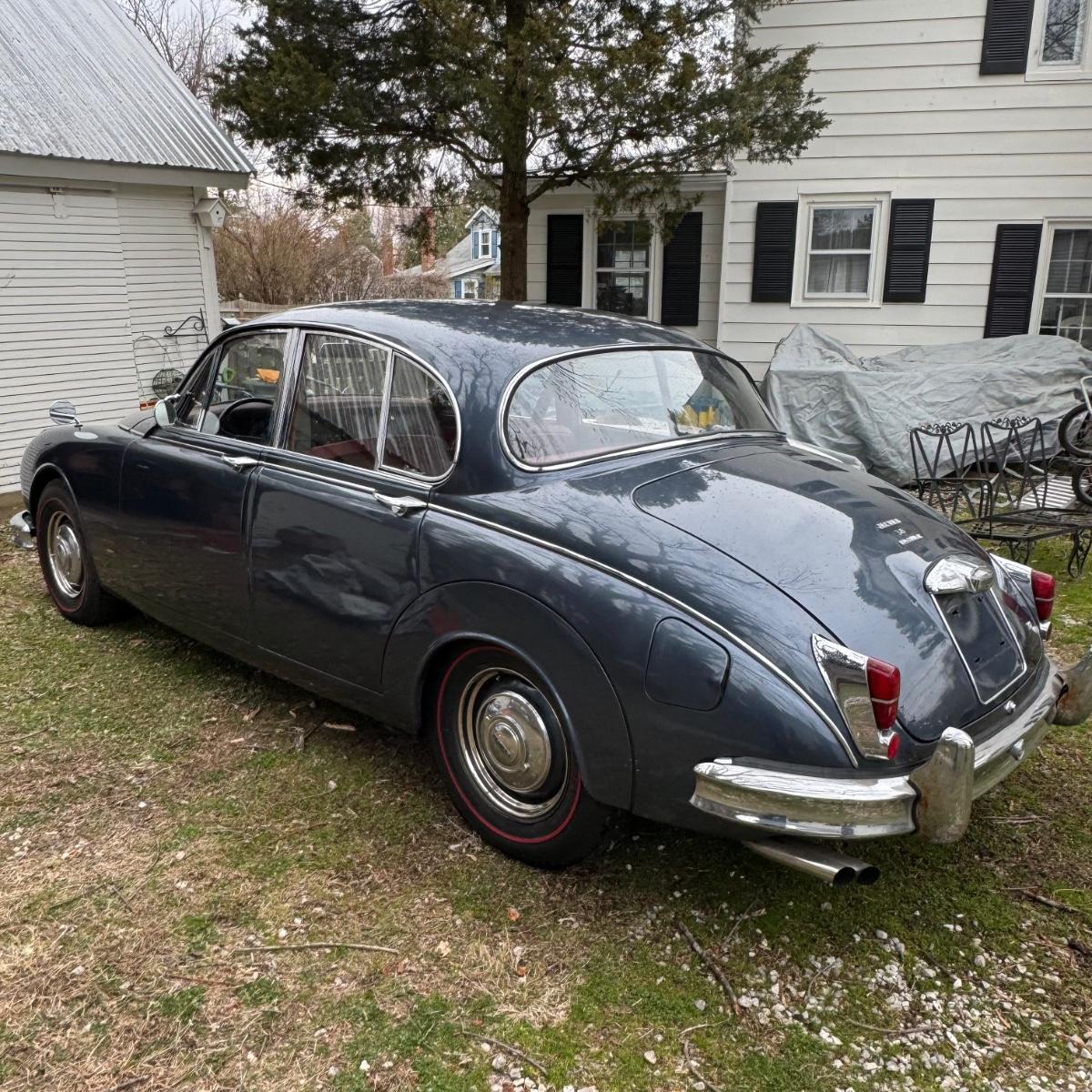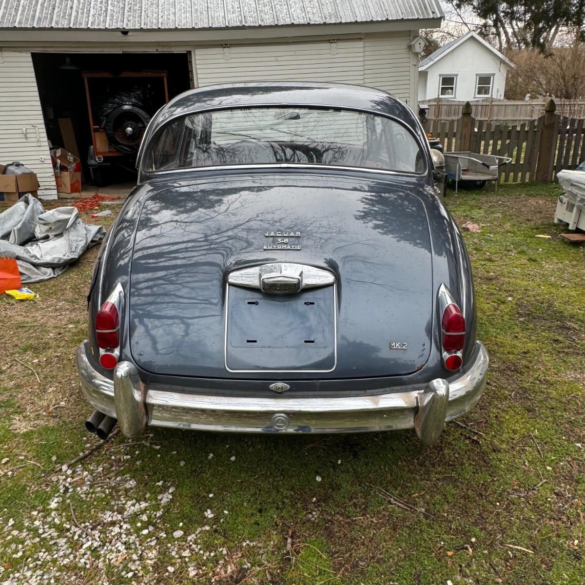 1963 Jaguar MK II, Bj. Don’t miss this opportunity to bid on this classic automobile. Overall condition great for its age. Very nice earlier restoration including new carpeting, leather seats and paint. With that said there are some areas where paint needs some repairs. New front and rear brake calipers, Lucas fog rangers, hoses, mirrors and drive shaft bearing. Car is complete with matching numbers. Cars engine turns over, however will not start due to fuel line leak. Comes with original manuals and addition books, and some new uninstalled parts. Please see pics for more details. Comes with car title No. 58867558